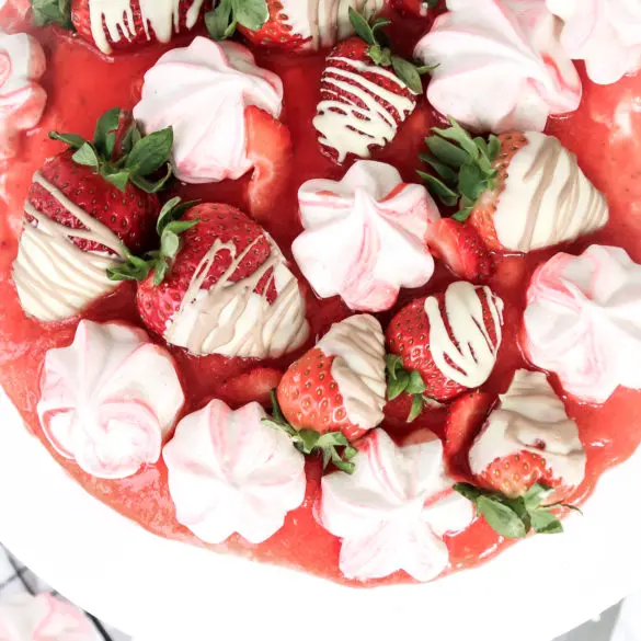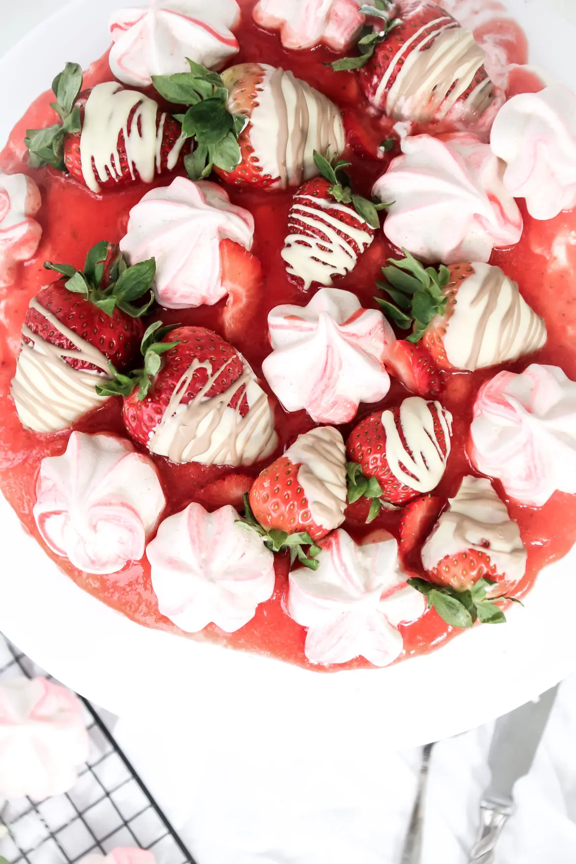 - Raðið svo súkkaulaðihúðuðu jarðaberjunum og marenstoppunum yfir hana og berið fram