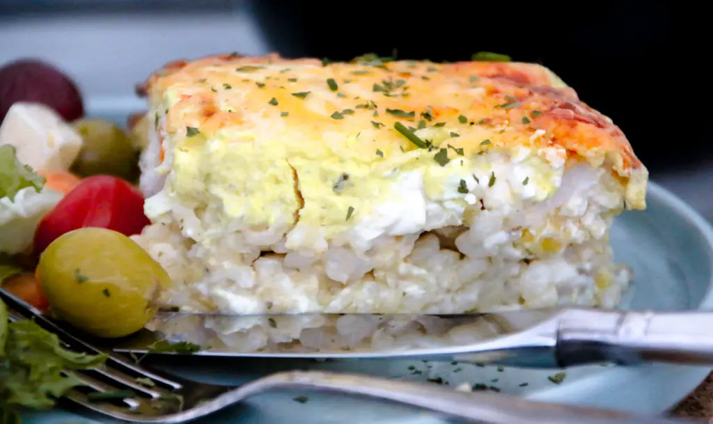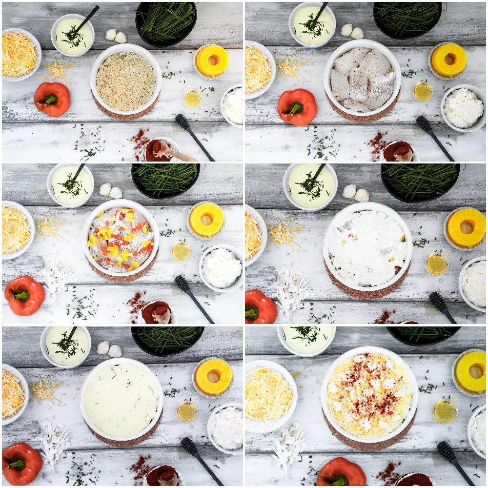 - Þegar grjónin eru soðin setjið þau þá í botninn á eldföstu móti