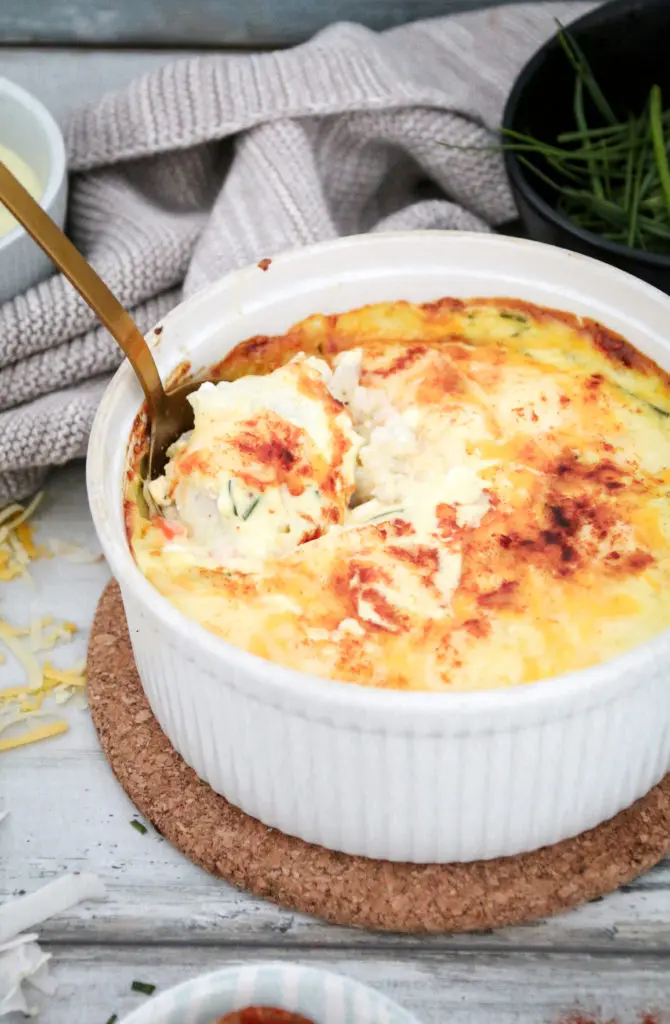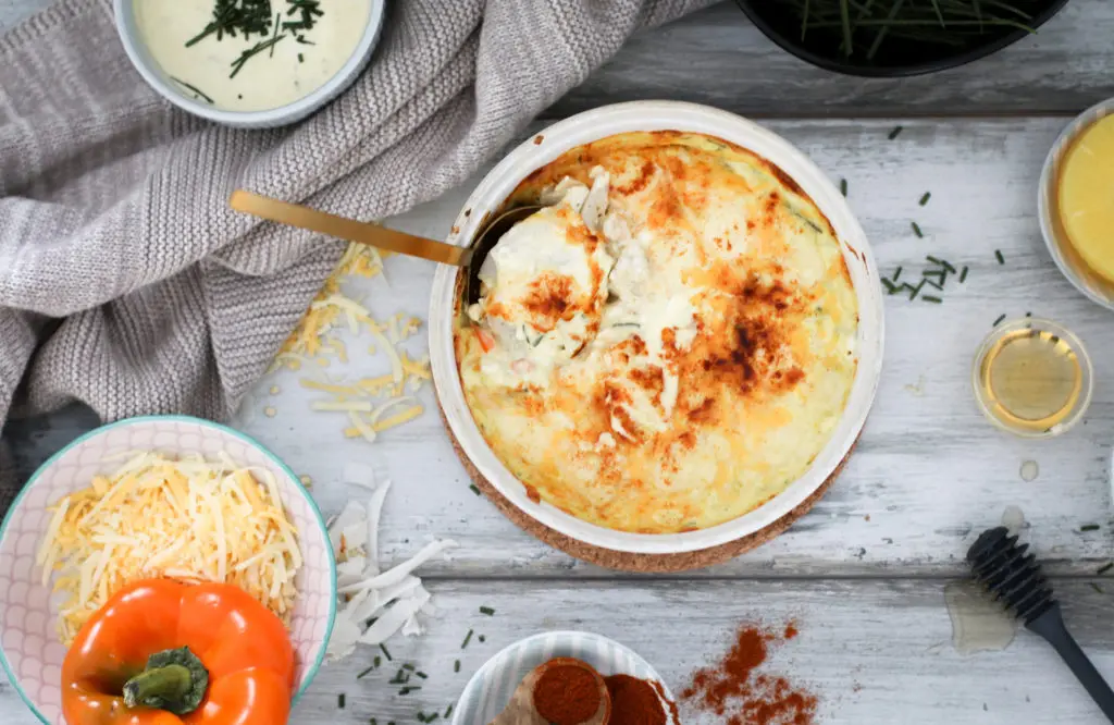 Dásamleg sæt sinnepssósa með graslauk toppar þetta svo allt með bræddum osti yfir.
