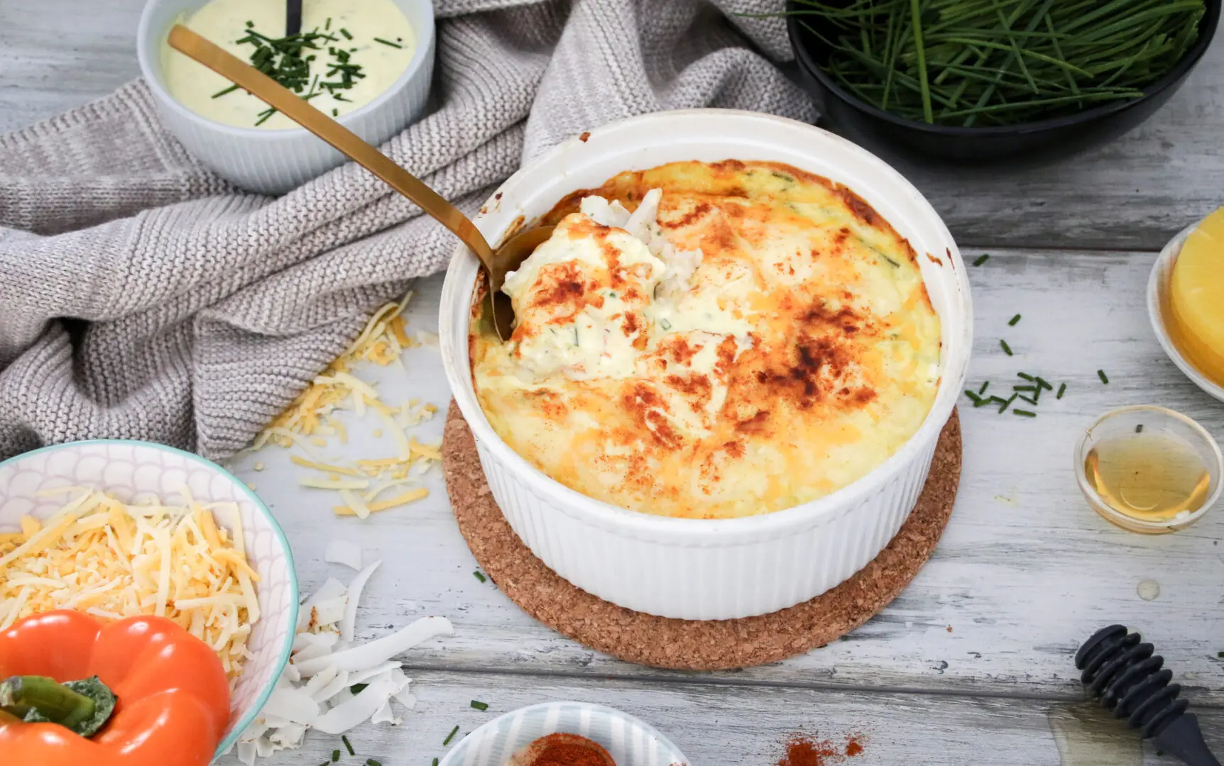 Dásamleg sæt sinnepssósa með graslauk toppar þetta svo allt með bræddum osti yfir.