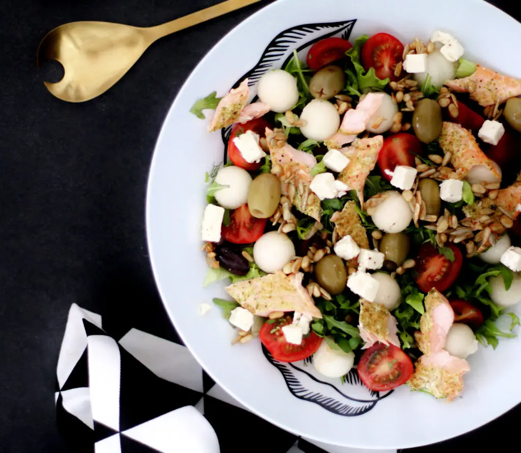 Salatið er pakkað af Omega-3 fitusýrum og annari hollri fitu. Þar mætist sæta á móti söltu, en sæt melónan og sólblómafræin eru fullkomið mótvægi við saltar ólífurnar, fetaostinn og fiskinn. Þið bara verðið að prófa….