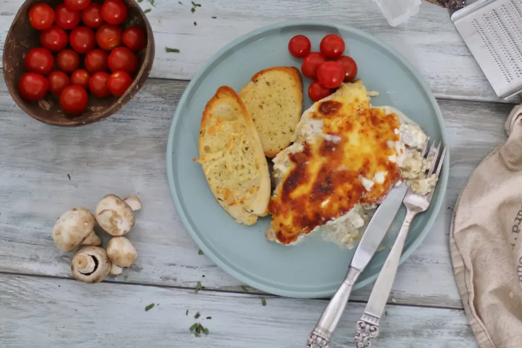 Restin er eins og að smyrja brauð nánast. Þennan er best að bera fram með fersku salati og hvítlauksbrauði. Best er að leyfa honum að standa aðeins á borði, í eins og 10 mínútur, meðan mesti rakinn og hitinn er að rjúka úr honum.
