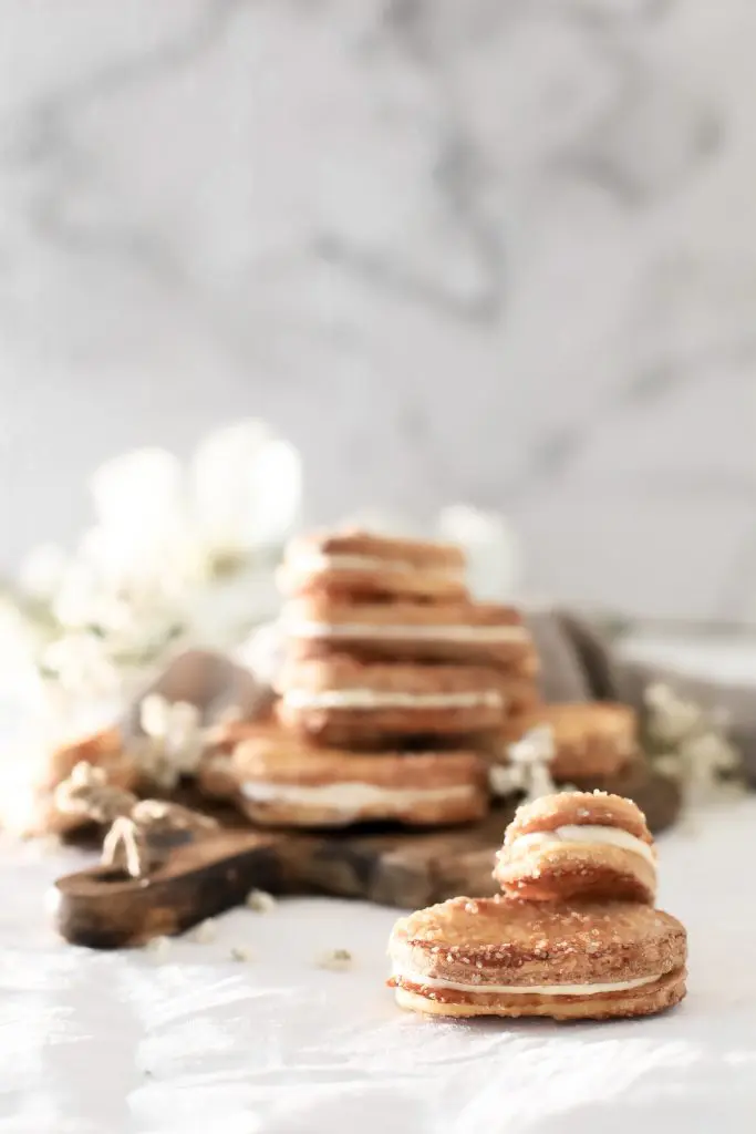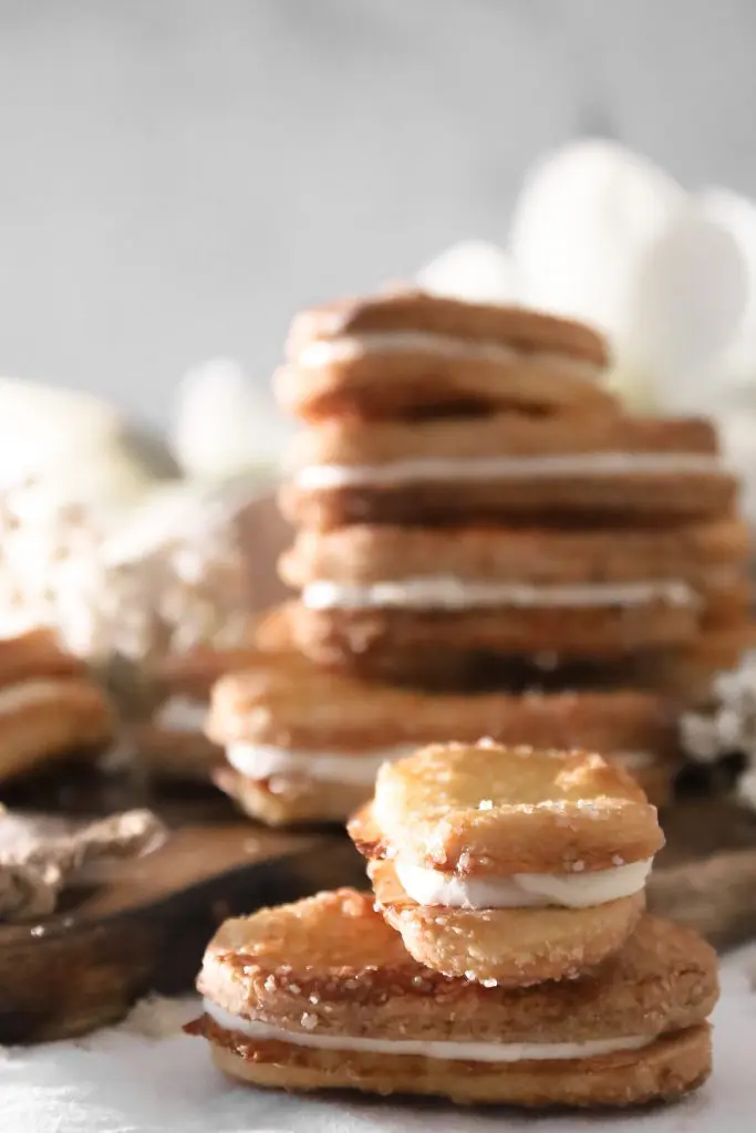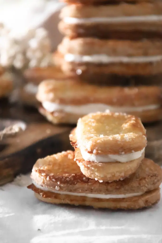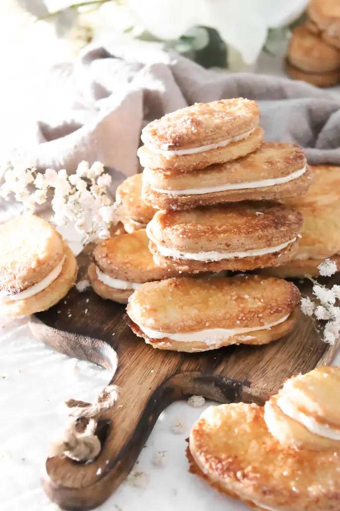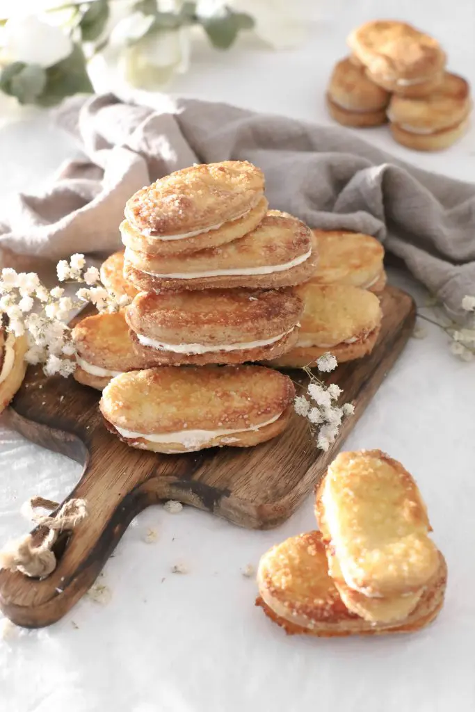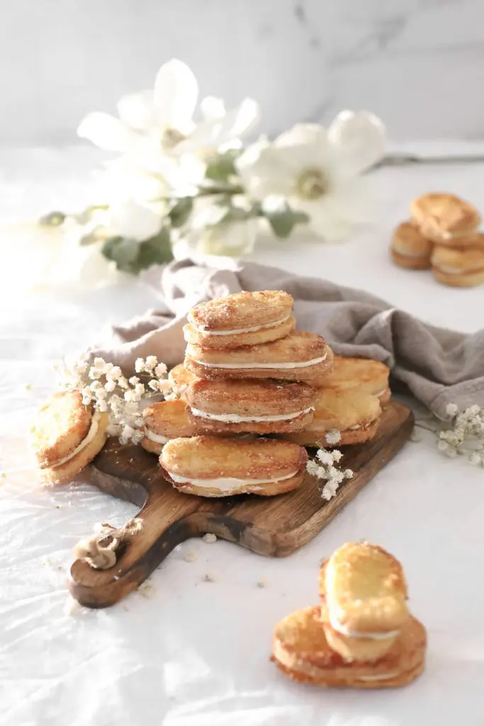 - Þegar vöfflurnar hafa kólnað sprautið þá kremi á einn helming í þunni lagi og leggjið svo aðra vöfflu yfir