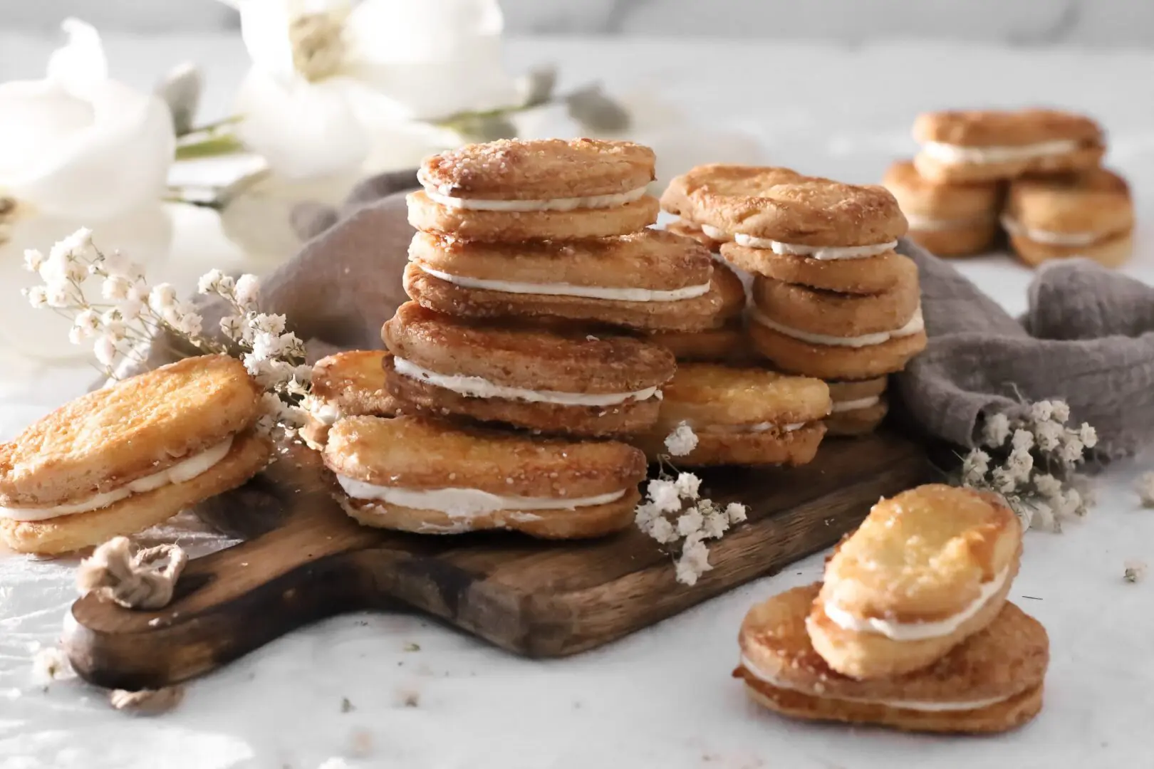 - Þegar vöfflurnar hafa kólnað sprautið þá kremi á einn helming í þunni lagi og leggjið svo aðra vöfflu yfir