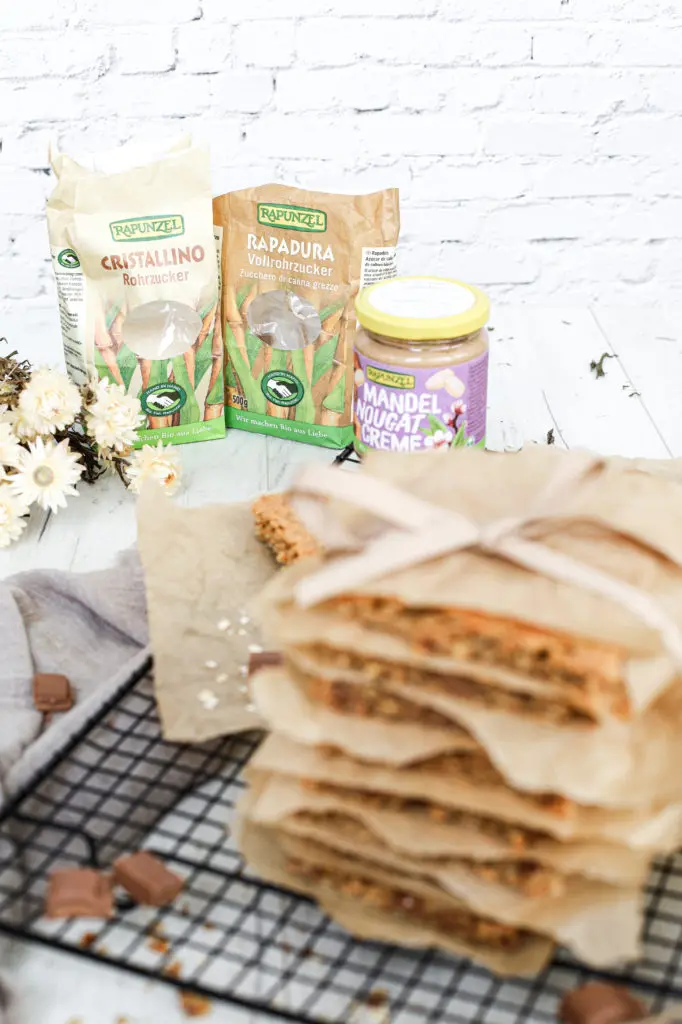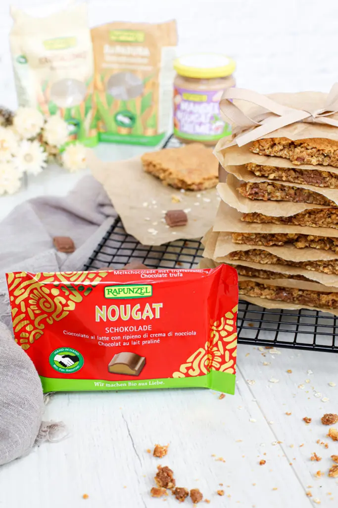 Þungir í sér, með stökkri þunnri skorpu, mjúkir, klístraðir og rakir inn í með dásamlegu Nougat súkkulaði frá Rapunzel……..Fullkomið !!