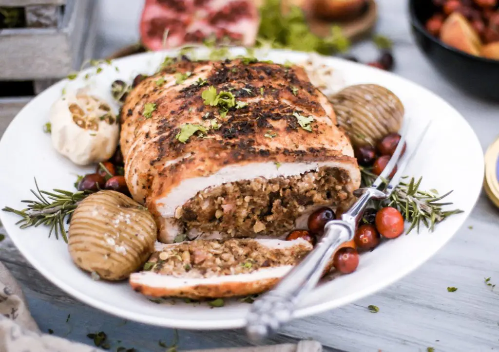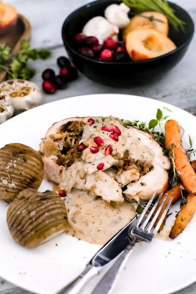 Almáttugur minn hvað þessi fyllta kalkúnabringa var guðdómlega góð !! Galdurinn er að sjálfsögðu gott krydd og fyllingin sjálf sem bara klikkar ekki.