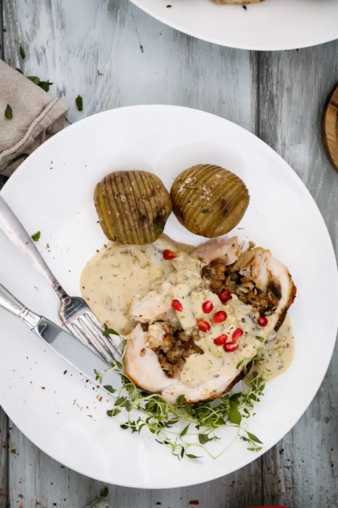 Fyrir mér var útkoman nánast fullkomin bæði bragðgott og afskaplega fallegt. Fyllingin samanstendur af sveppum, hvítlauk, rjómaosti, beikoni, brauðteningum, furuhnetum og þurrkuðum apríkósum algjörir töfrar fyrir bragðlaukana.