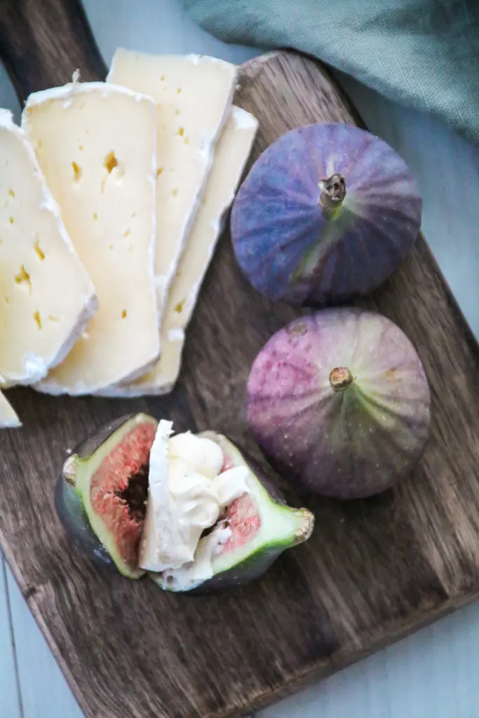 - Setjið annað hvort gráðostinn inn í fíkjuna, fyrir þá sem það vilja, en fyrir ykkur hin setjið þá eina sneið af Brie osti og 1/2-1 tsk af hvílauksrjómaosti