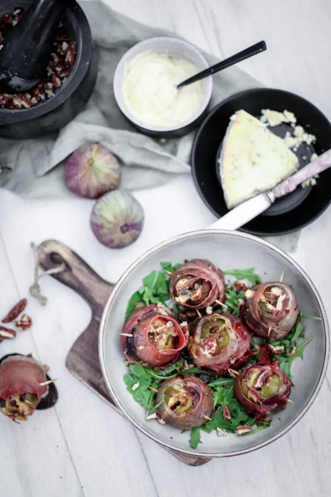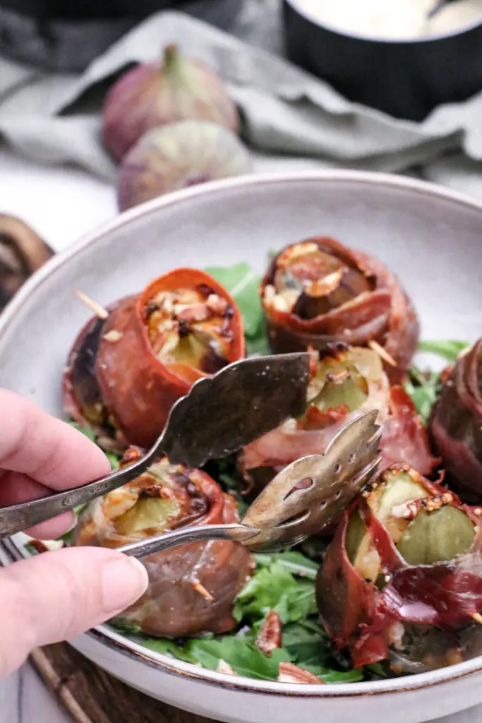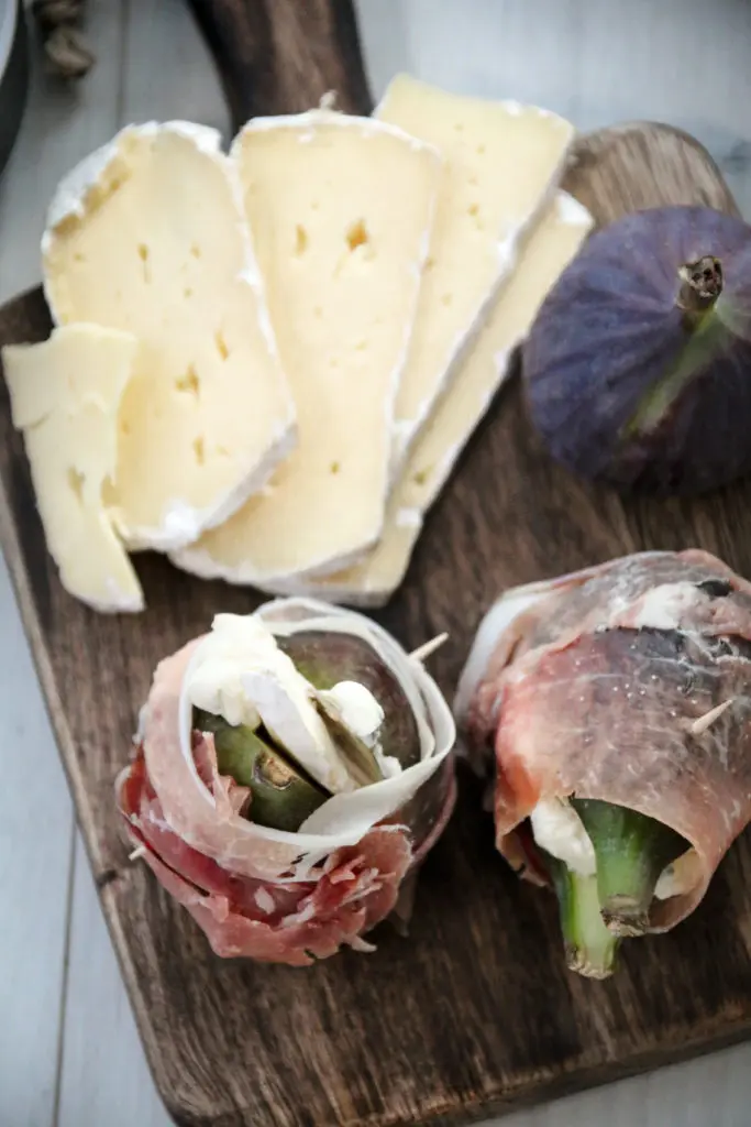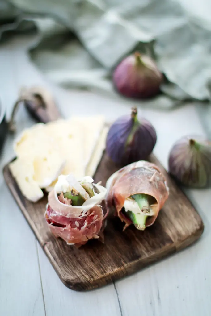 - Lokið nú Fíkjunni og vefjið hráskinku utan um og stingið tannstöngli þvert í gegnum hana miðja