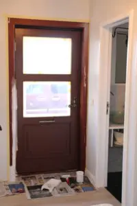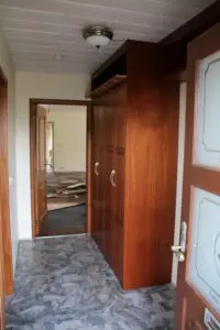 Það sem við byrjuðum á að gera var að taka niður skápinn og í staðinn fyrir hann kom hurð inn í eitt barnaherbergið. Einnig tókum við allar hillur af veggjum og fjarlægðum hurðina inn í húsið til að opna alveg inn.