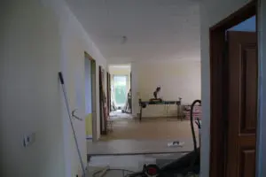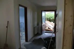 Allt gólfefnið var svo brotið upp. Til þess leigðum við okkur brothamar á leigumarkaði Byko, en það létti verkið til muna. Síðan notuðum við hurðina sem var innangengt úr eldhúsinu í þvottahúsið, og notuðum hana í nýja hurðaropið inn í barnaherbergið. Áður hafði verið gengið úr stofunni inn í barnaherbergið sem þá var notað sem skrifstofa.