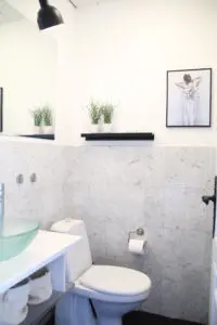 Það sem við gerðum var að lakka marmarann á gólfinu svartann. Við grunnuðum hann fyrst með olíugrunni og notuðum svo venjulegt háglans vatsnlakk yfir með 90 % gljáa sem við keyptum í Flugger.