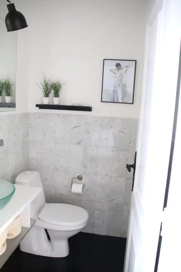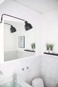 Veggina máluðum við hvíta og borðplatan var grunnuð og lökkuð. Að lokum var skipt um klósettsetu og falleg mynd frá Vee Speers sett upp á vegg og lampi úr Söstrene Grene fyrir ofan spegilinn. Þetta kostaði okkur ekkert þar sem við notuðumst við málningu sem við áttum til.  Það sem á eftir að gera á gestabaðinu er að setja upp gólflistana eins og er í húsinu.