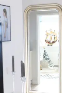 Hér sést inn í barnaherbergið úr speglinum á ganginum