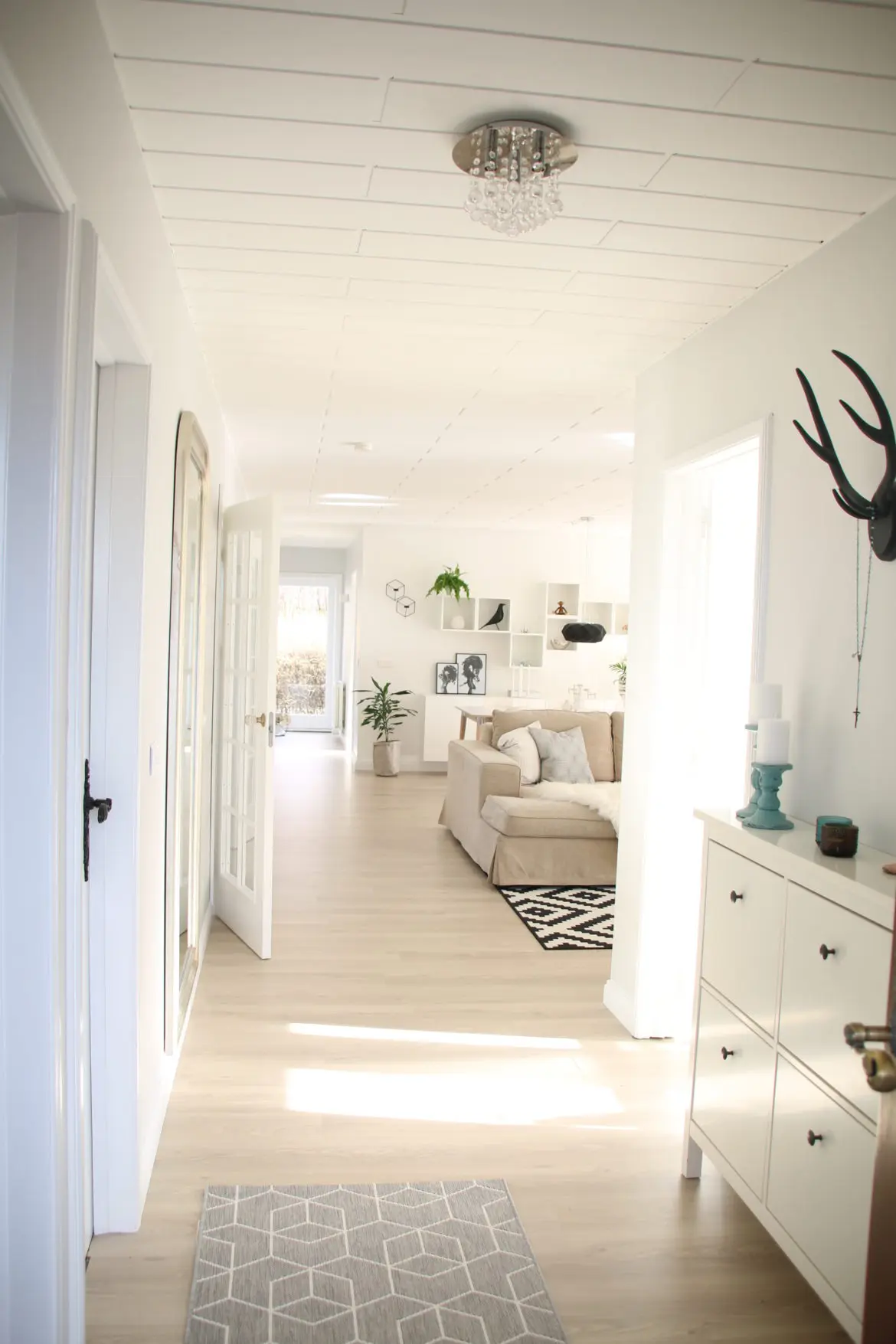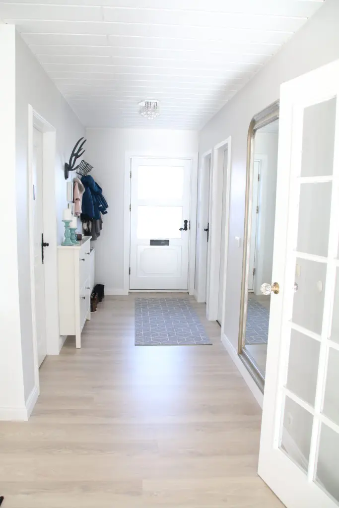 Þegar við fengum afhent var forstofan löng og mjó og hægt var að loka hana af. Þar var mikið um skápa og hillur og allt var í dökkum við. Gólfefnið var marmari, en þó marmari sé mjög mikið inn núna, þá ákváðum við að henda þessum út. Bæði fannst okkur hann ekki nógu flottur og svo vildum við hafa sama gólffefni á öllu húsinu nema baðinu.