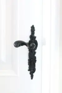 Svo máluðum við allar innihurðirnar hvítar og notuðum gömlu húnana sem einnig voru sprautaðir svartir.