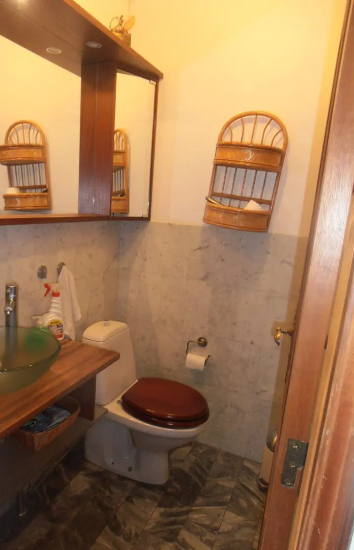 Þegar gengið er inn í húsið er fyrsta hurðin til vinstri gestabaðherbergi. Við ákváðum að vera ekkert að splæsa mikið í það og notuðumst við því við það sem var til staðar og máluðum bara. Reyndar tókum við niður speglaskápana sitthvorumegin við spegilinn líka.