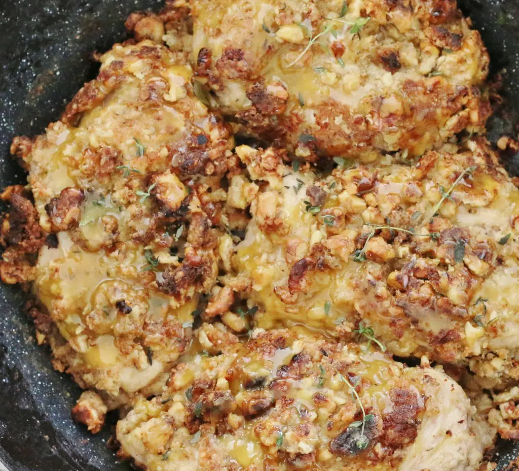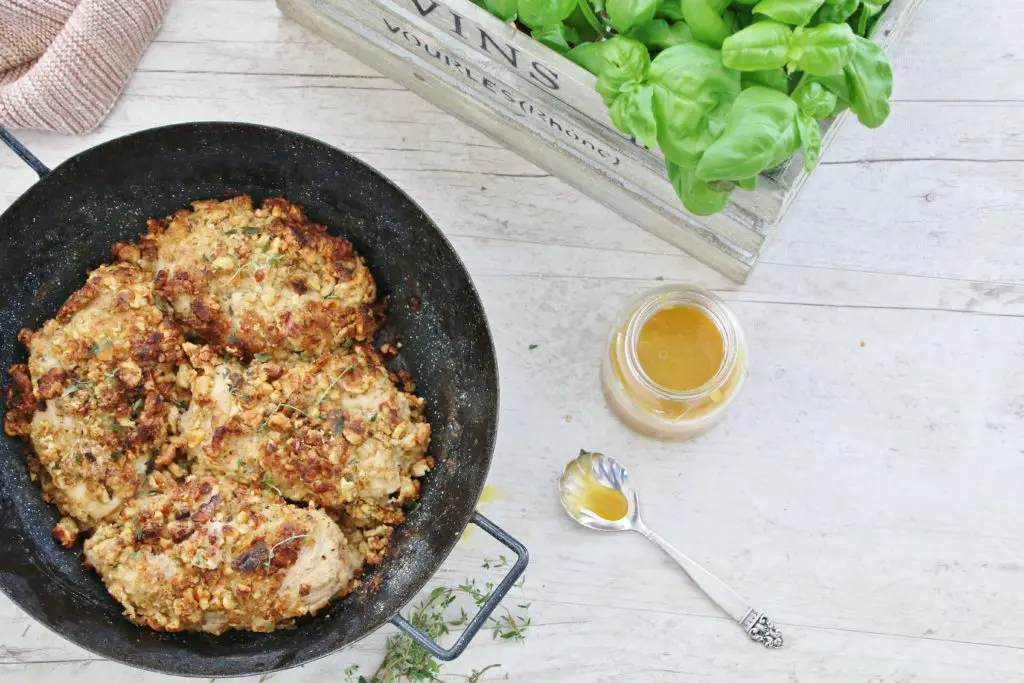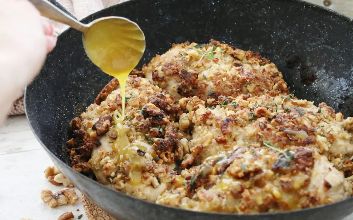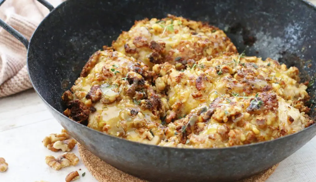 - Takið bringurnar og hristið örlítið aukamareninguna af og veltið upp úr í valhnetublöndunni báðum megin. Passið að þekja þær vel í valhnetublöndunni.