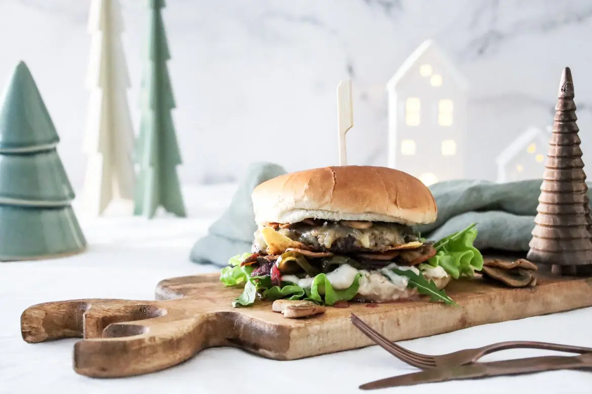 - Kjötið kemur svo ofan á allt heila klabbið og sveppirnir efst og loka svo með efra brauði og njóta !!!