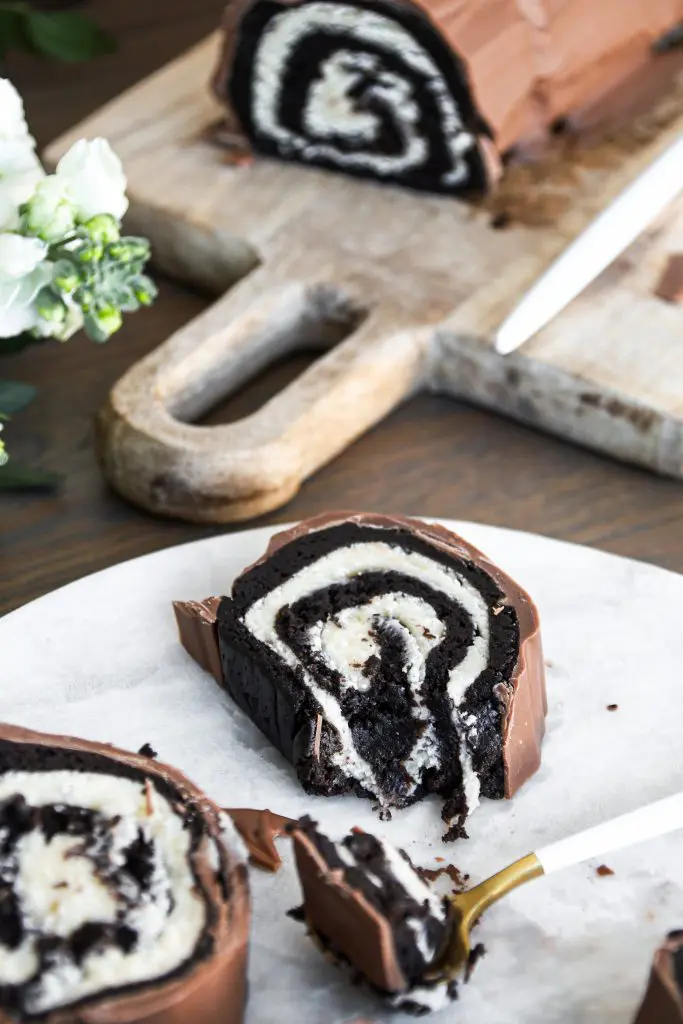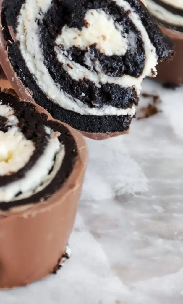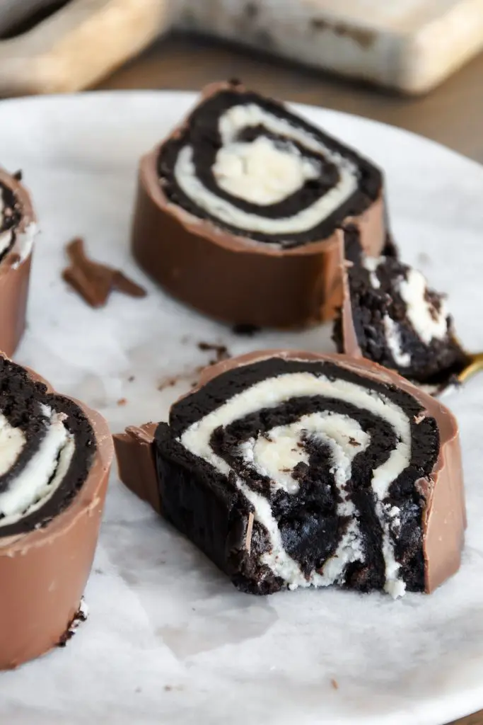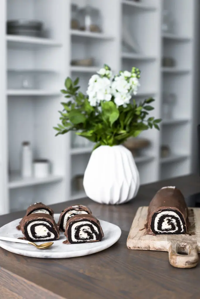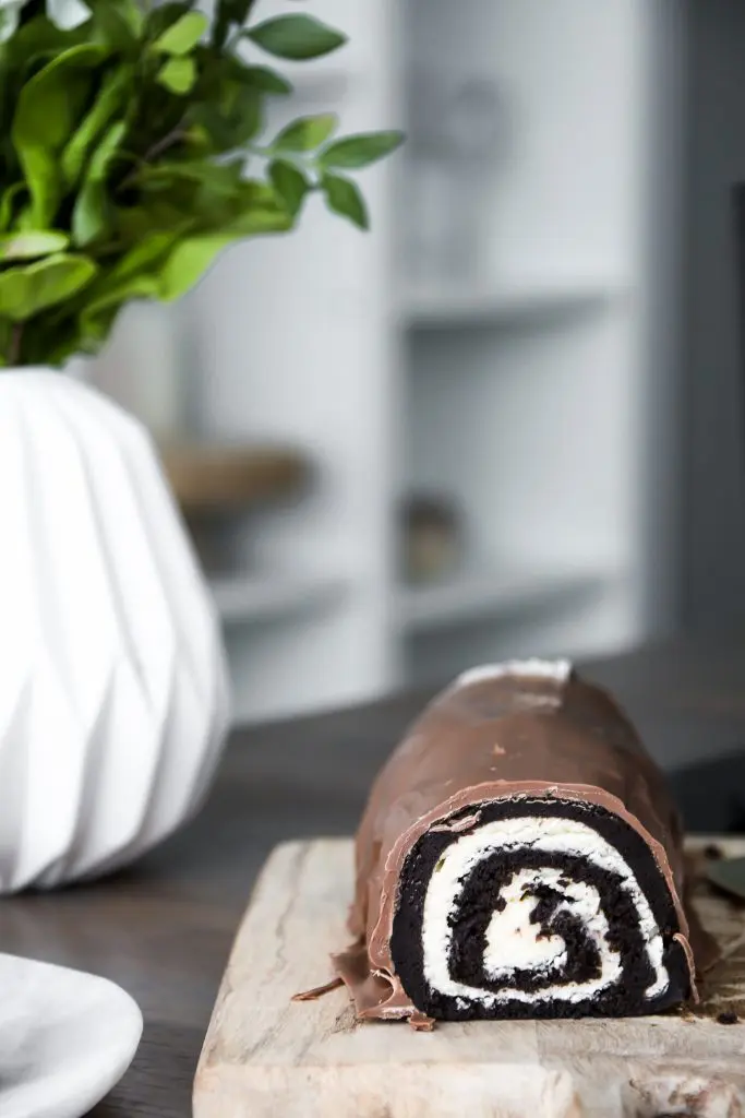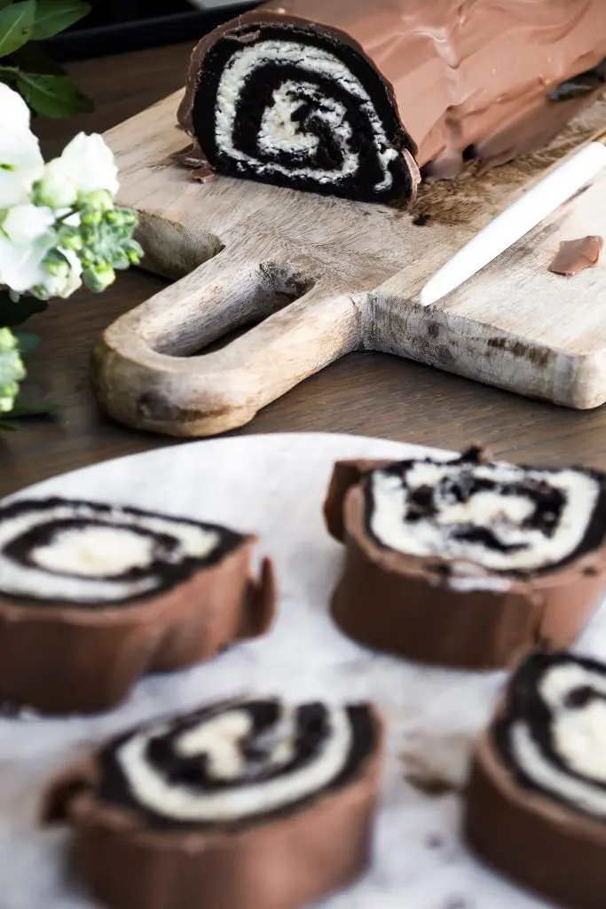 Oreo rúlluterta með rjómaosta vanillukremi og súkkulaðihjúp