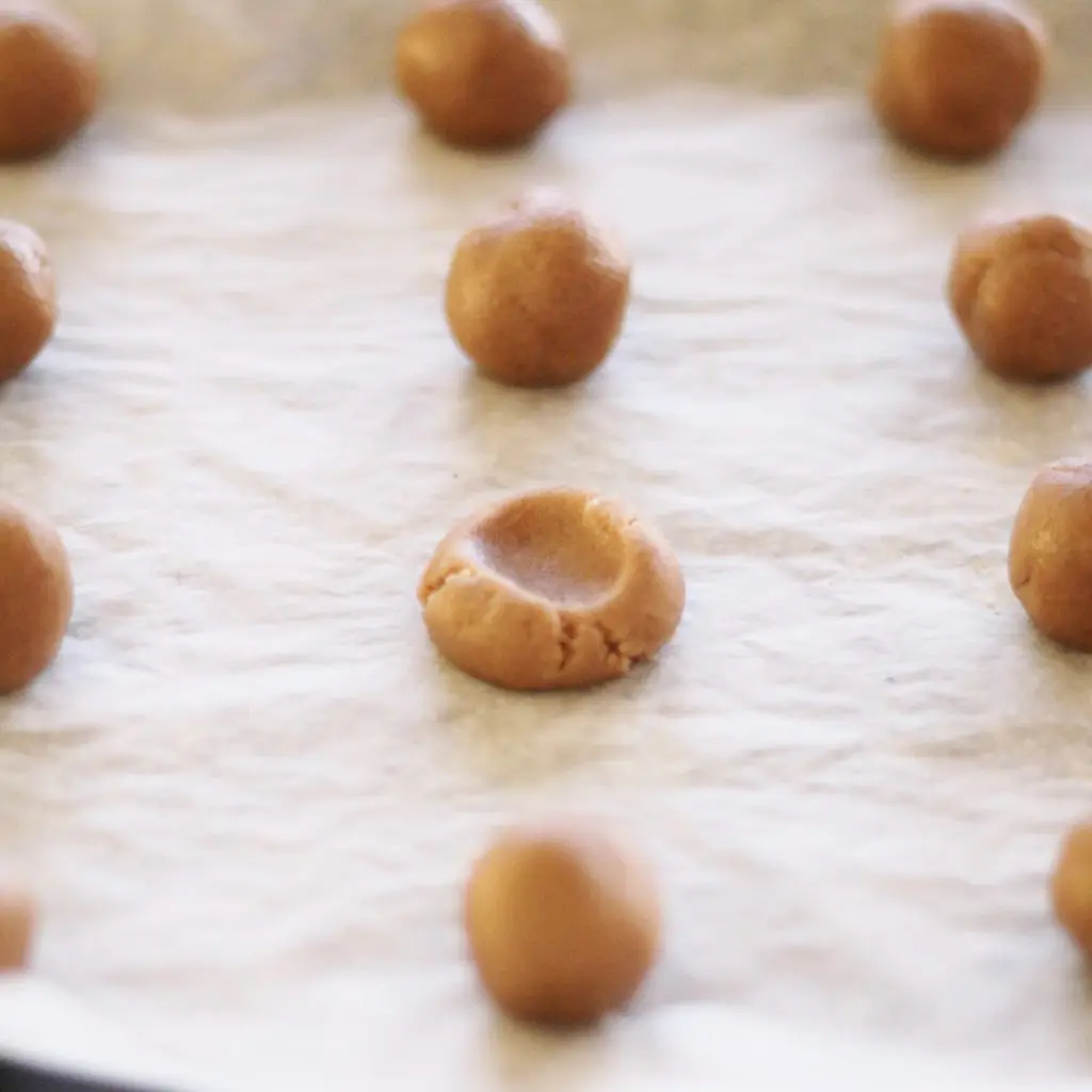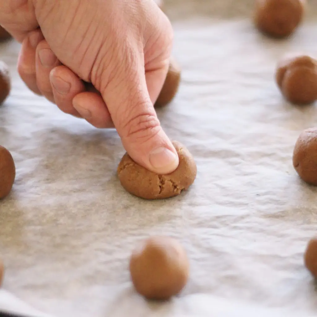 - Takið svo deigið úr kæli og mótið kúlur á stærð við heimagerðar kókóskúlur og setjið á bökunarplötu með bökunarpappír. Þrístið svo einum fingri niður í deigið til að mynda dæld eins og sýnt er á myndinni fyrir ofan. Þetta er gert við allar kúlurnar svo þær verði fallegri í laginu.