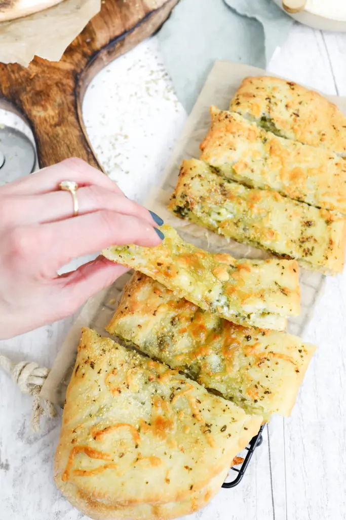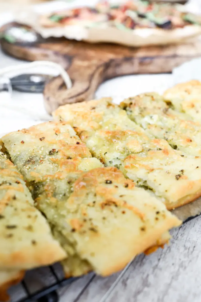 Rucola pesto ostabrauðstangirnar voru ekki síðri en þær verða að vera með pizzuni því þessi tvenna var eitthvað annað góð.