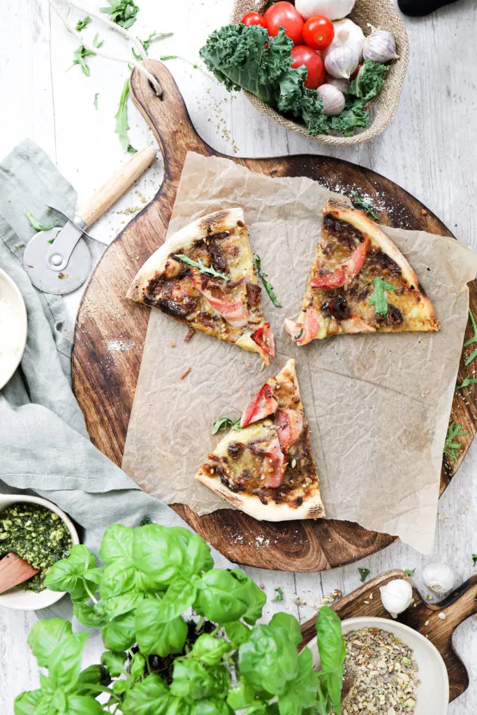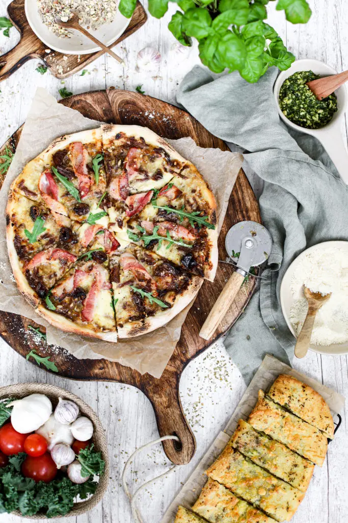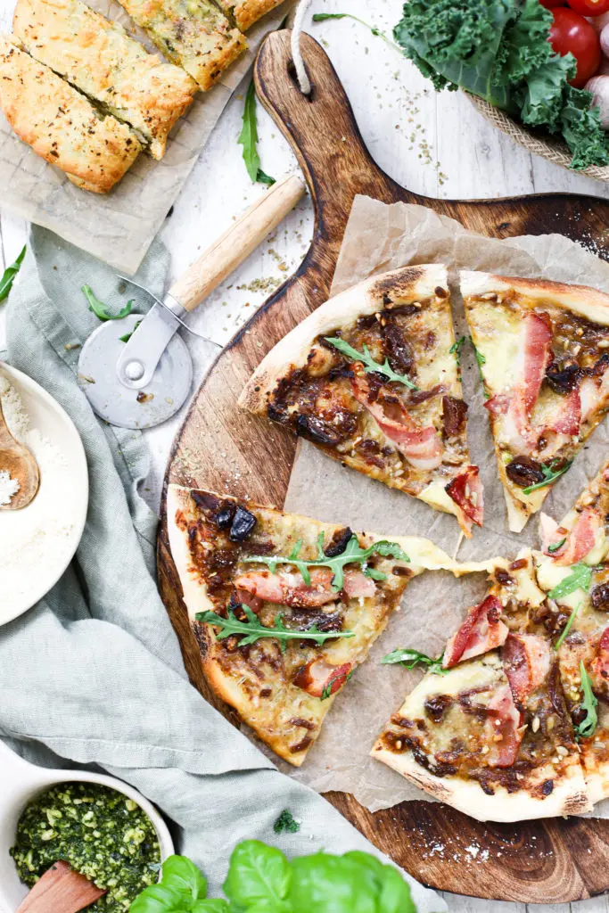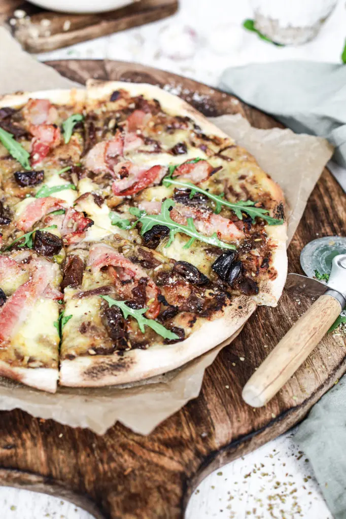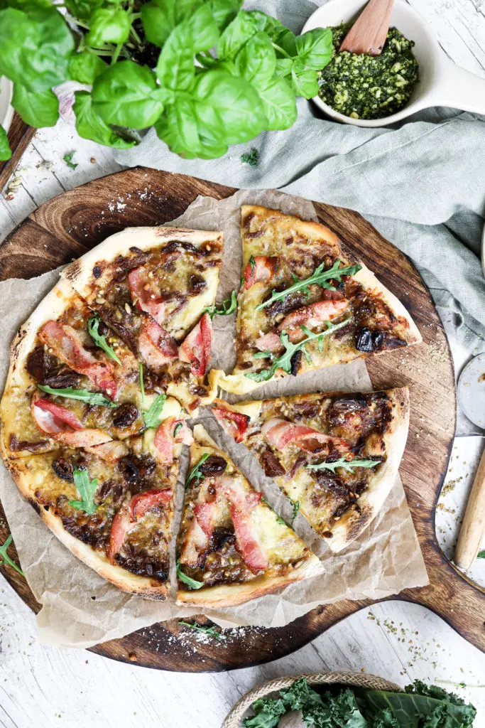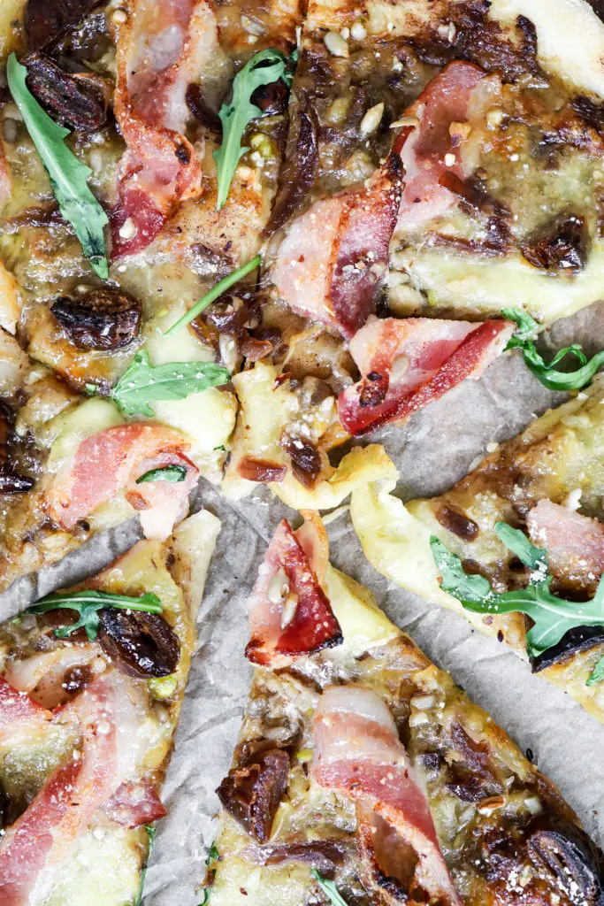 Pizzan er án pizzasósu því hér notaði ég döðlusultu í stað hennar og toppaði svo með beikon, 3 tegundum af ostum, kryddhnetukurli og dásamlegri rauðlaukssælu.