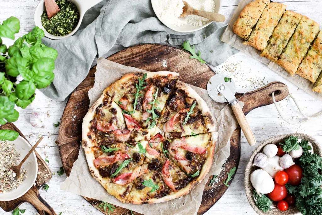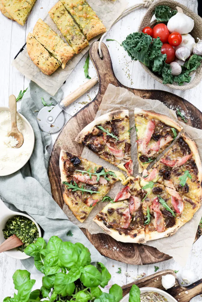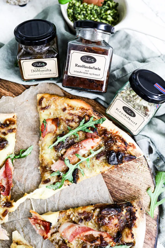Ég fékk m.a að prófa dásamlegu döðlusultuna frá þeim en þannig kviknaði hugmyndin hjá mér að þessari pizzu og brauðstöngum sem þið verðið að prófa.
