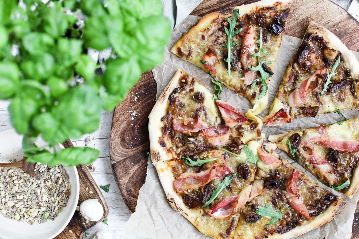 Pizzan er án pizzasósu því hér notaði ég döðlusultu í stað hennar og toppaði svo með beikon, 3 tegundum af ostum, kryddhnetukurli og dásamlegri rauðlaukssælu.