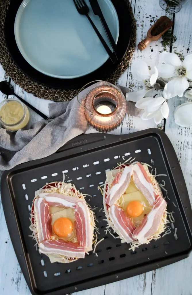 Svo raða ég beikoninu í kringum eggið ofan á ostinn og salta og pipra eggið í miðjunni. En nú áttið þið ykkur örugglega betur á þessu.