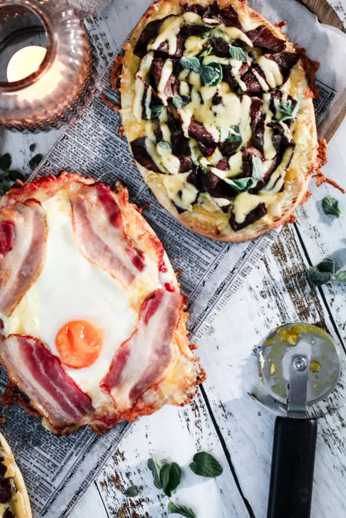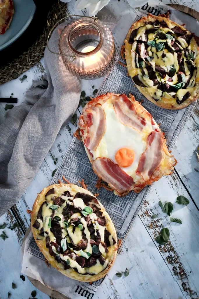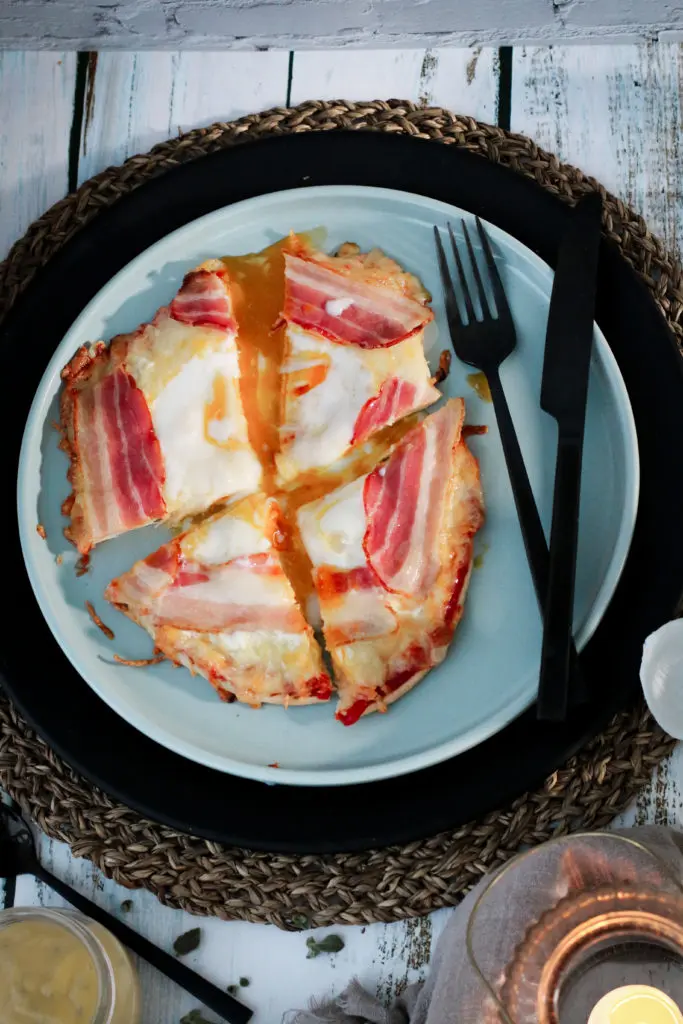 - Raðið svo beikonsneiðum í kringum eggið ofan á mozzarella ostinn
