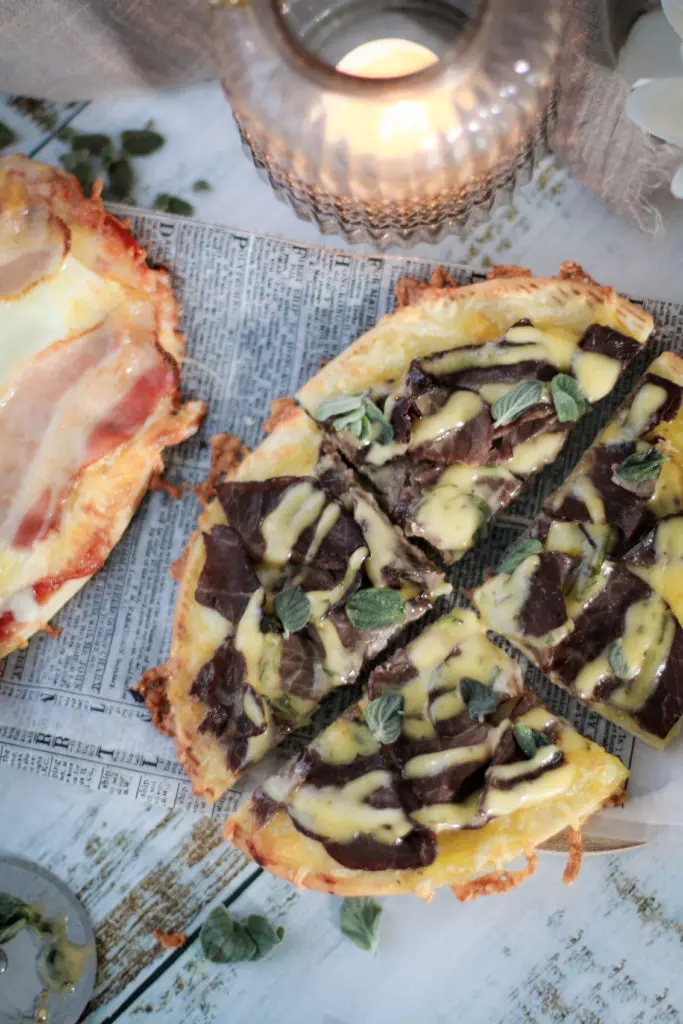 - Setjið svo eins og 50 gr af tilbúnu Roast Beef á hverja pizzu ofan á ostinn