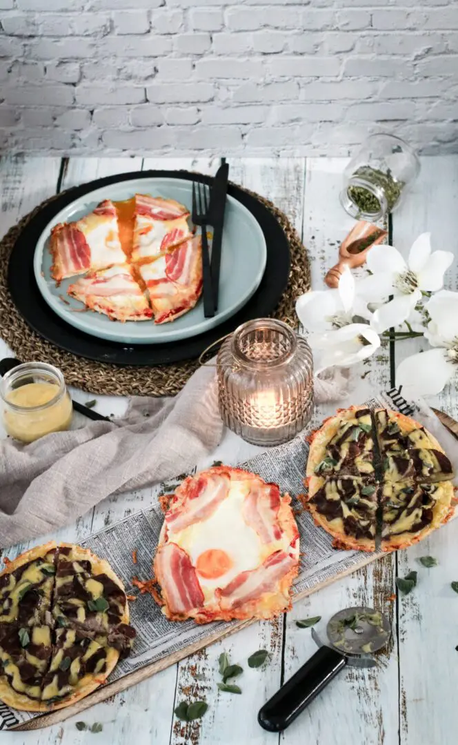 - Raðið svo beikonsneiðum í kringum eggið ofan á mozzarella ostinn