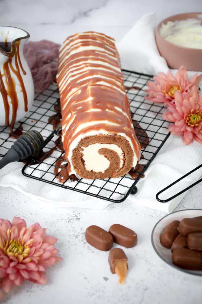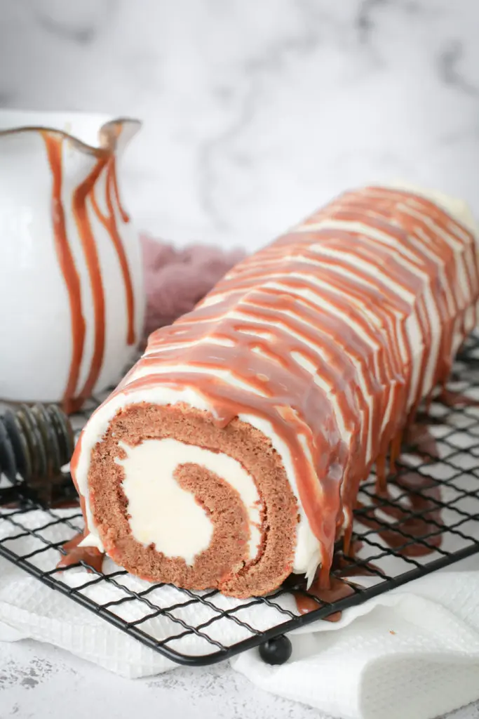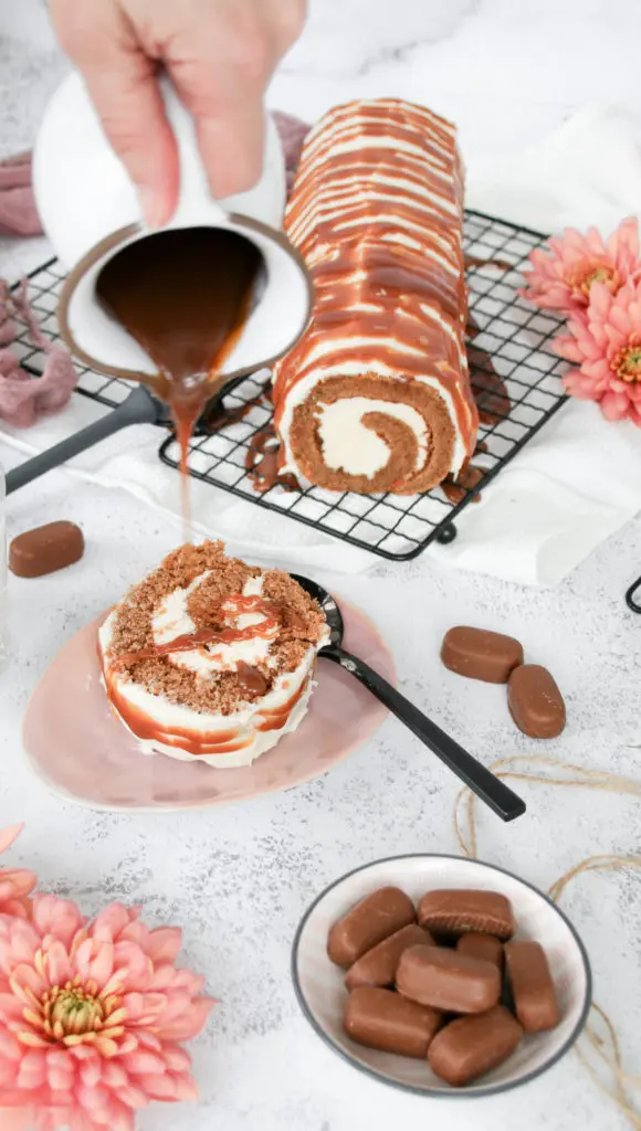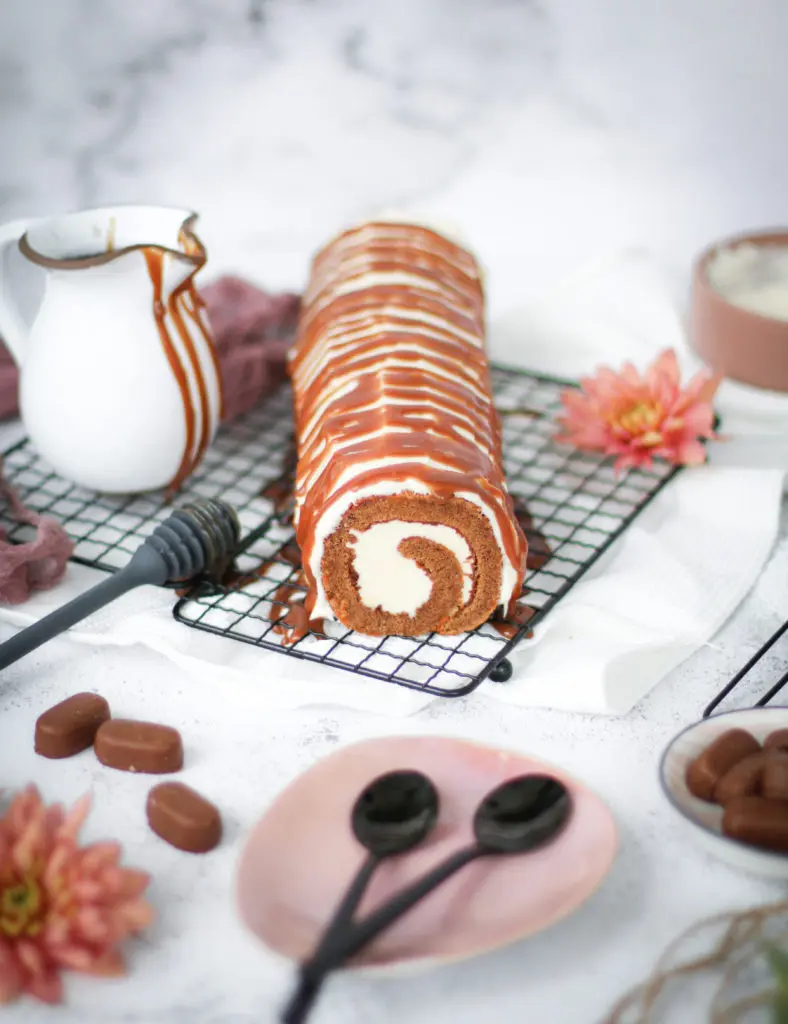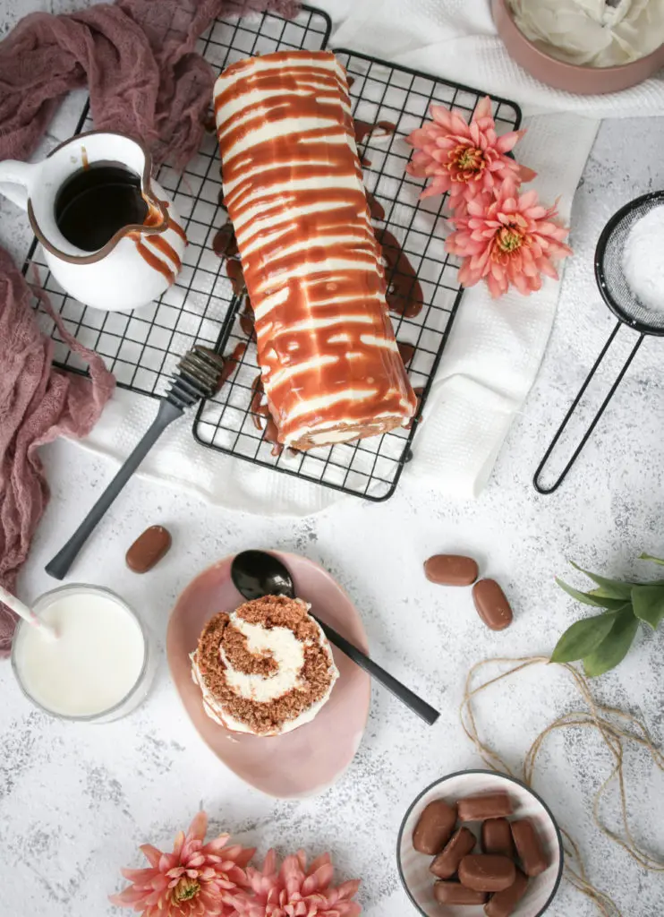 Það er bara eitthvað svo fallegt að sjá inn í rúlluna og mjallahvíta ostakremið sem er á milli og glansandi silkimjúka karamelluna dreitla niður hliðar hennar.