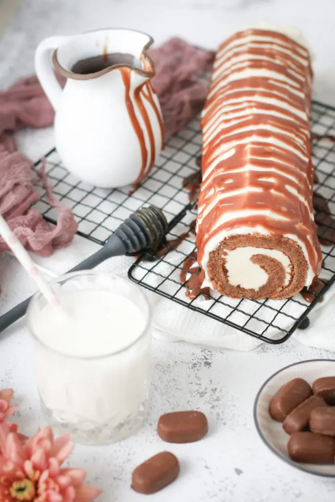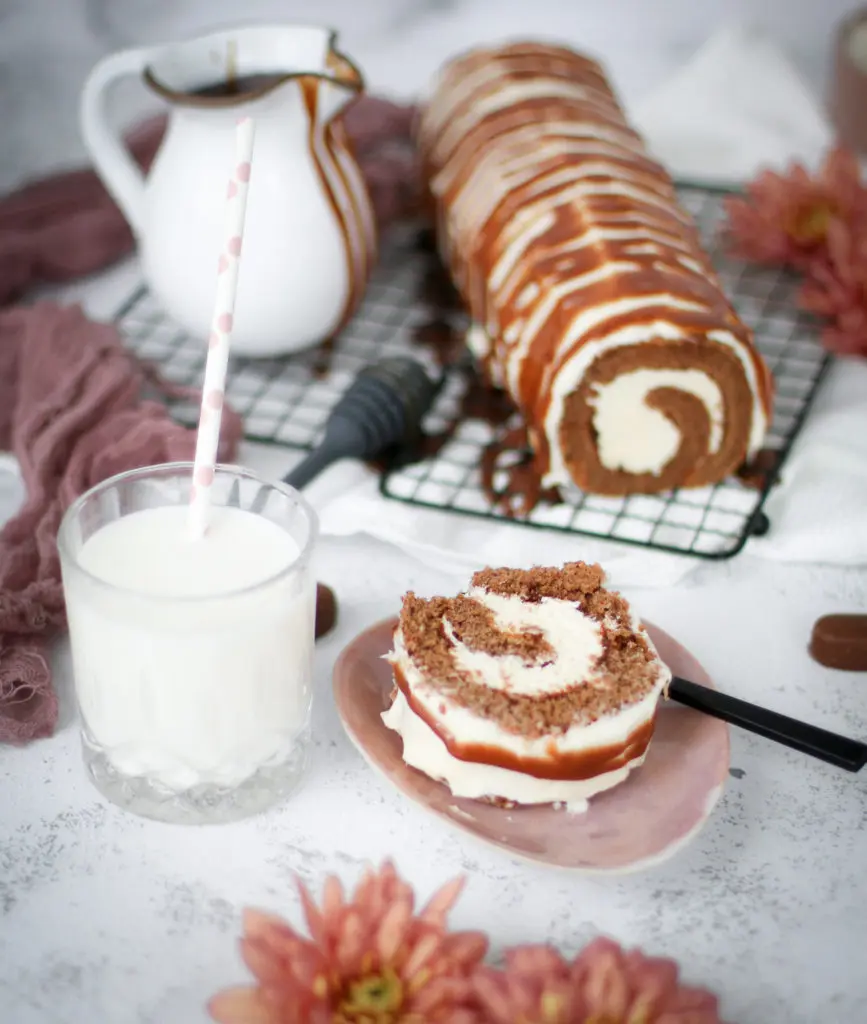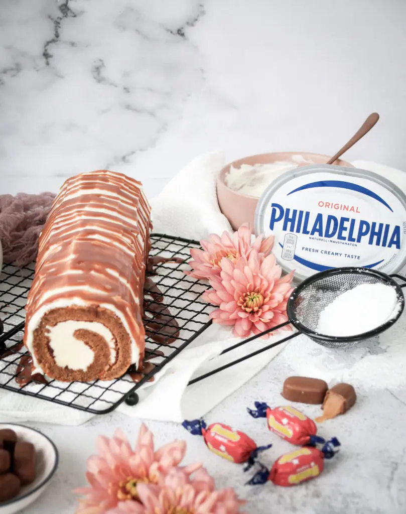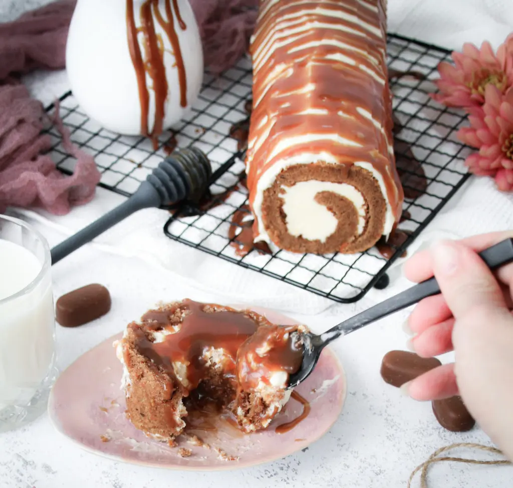 Það er bara eitthvað svo fallegt að sjá inn í rúlluna og mjallahvíta ostakremið sem er á milli og glansandi silkimjúka karamelluna dreitla niður hliðar hennar.