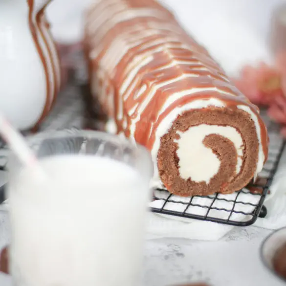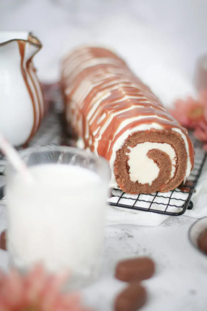 Það er bara eitthvað svo fallegt að sjá inn í rúlluna og mjallahvíta ostakremið sem er á milli og glansandi silkimjúka karamelluna dreitla niður hliðar hennar.