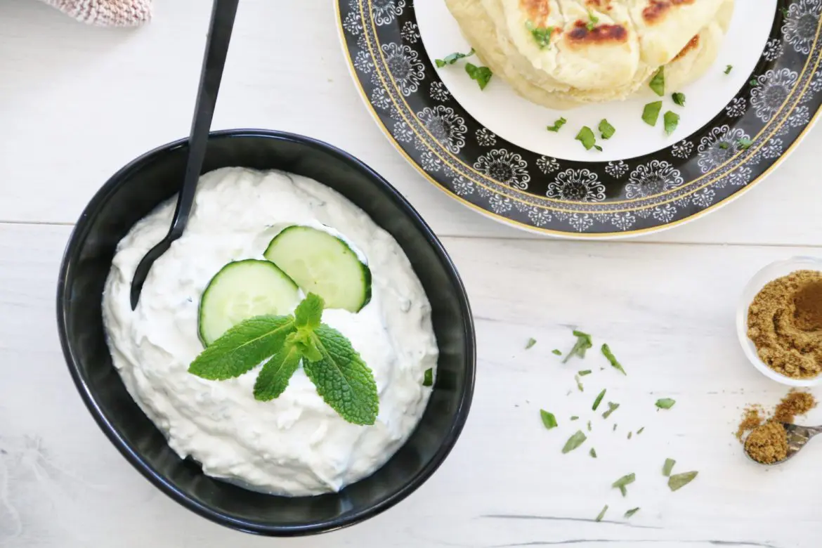 - Hrærið út jógúrtina og setjið í hana allt úr uppskriftinni nema gúrku og myntu