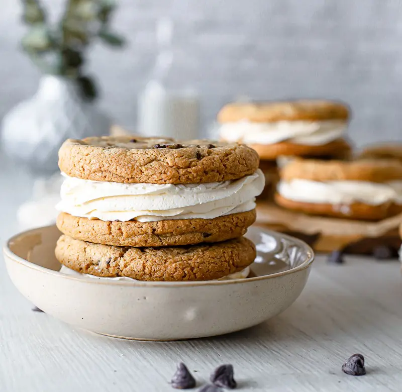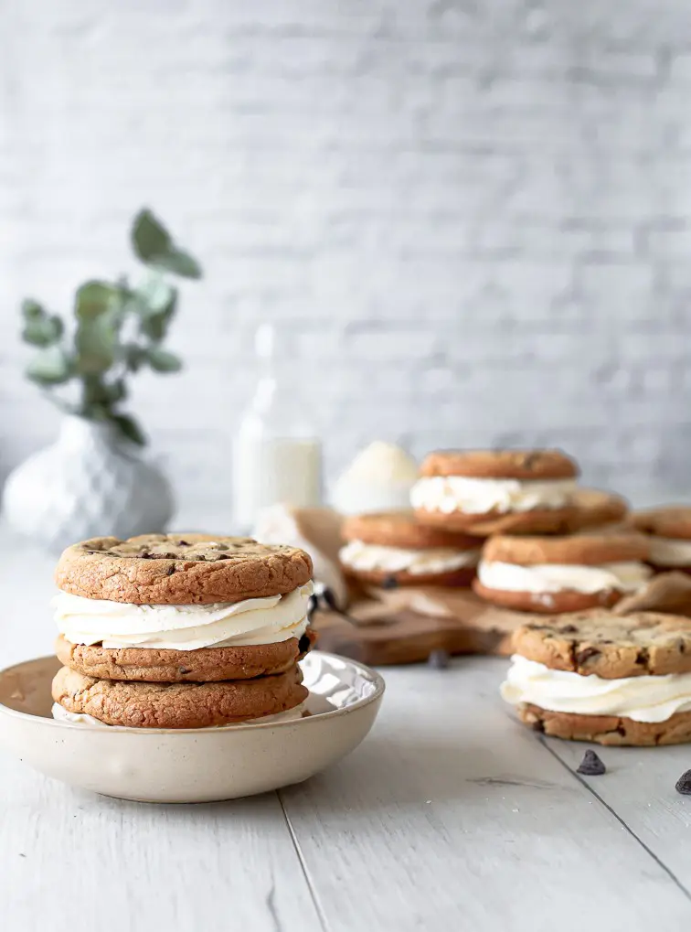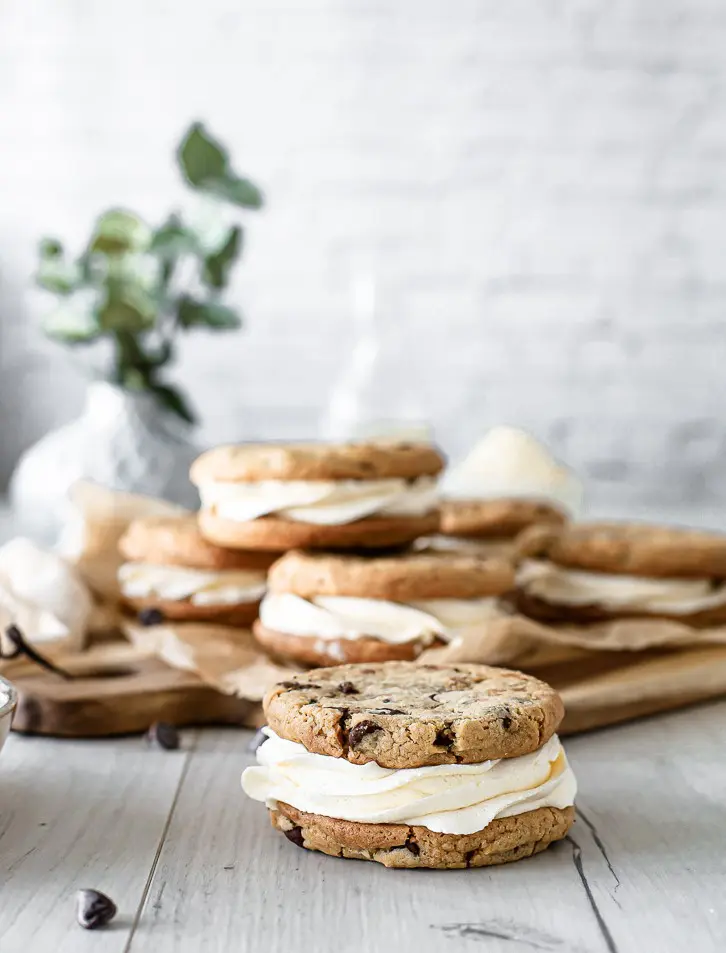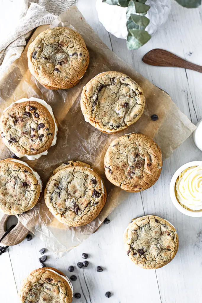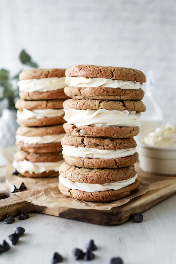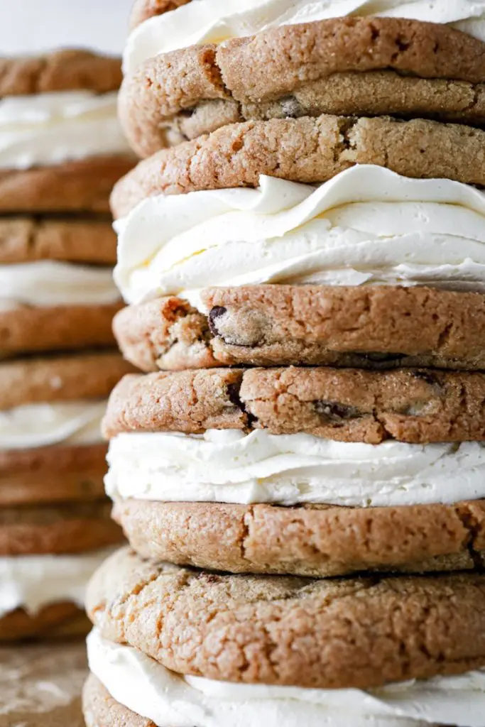 - Þegar kökurnar hafa alveg kólnað setjið þá kremið í sprautupoka með stjörnustút og sprautið á eina köku og lokið svo með annari ofan á. Það má líka smyrja kreminu á ef þið viljið sleppa því að sprauta því