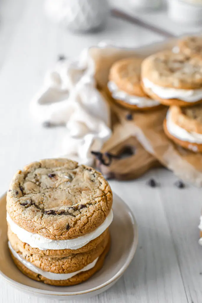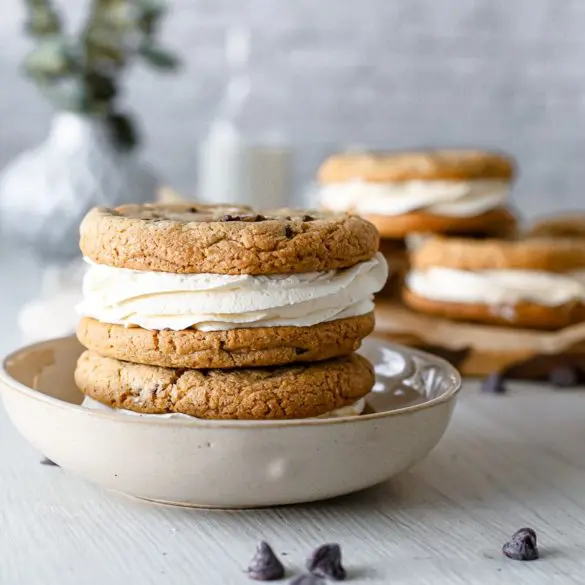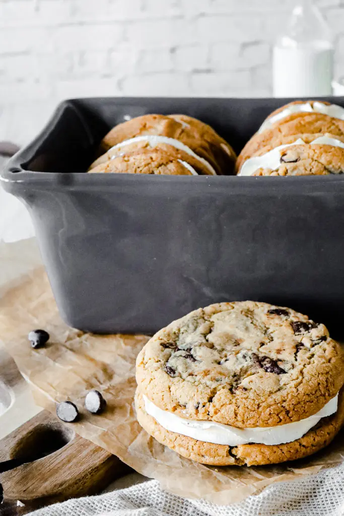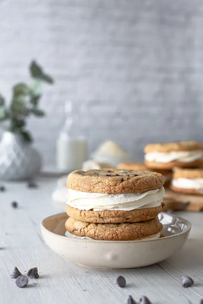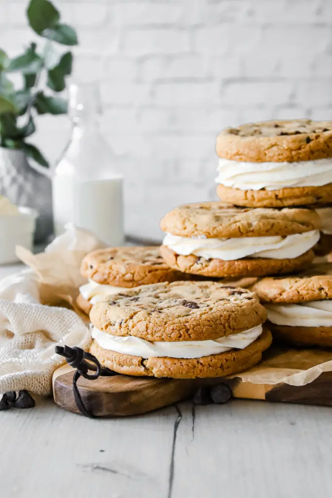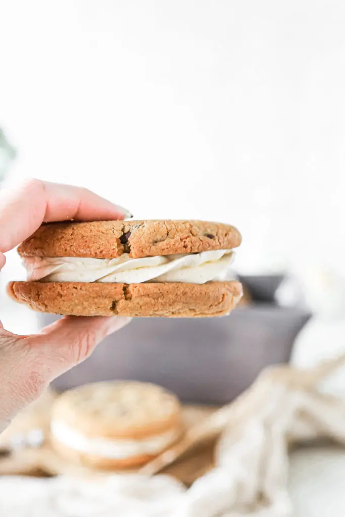 - Þegar kökurnar hafa alveg kólnað setjið þá kremið í sprautupoka með stjörnustút og sprautið á eina köku og lokið svo með annari ofan á. Það má líka smyrja kreminu á ef þið viljið sleppa því að sprauta því