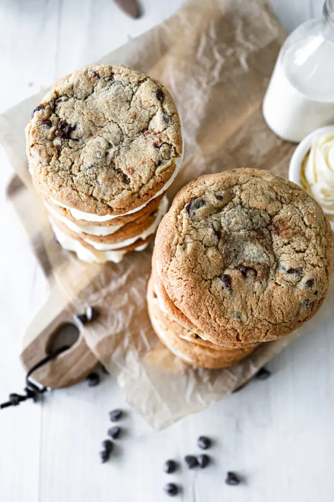 - Bætið að lokum við súkkulaðidropum og hrærið annað hvort á lægsta í hrærivél eða með sleif þar til súkkulaðið er nægilega blandað við deigið (passa að hræra ekki of mikið ef gert er í hrærivél, þá brotnar súkkulaðið)