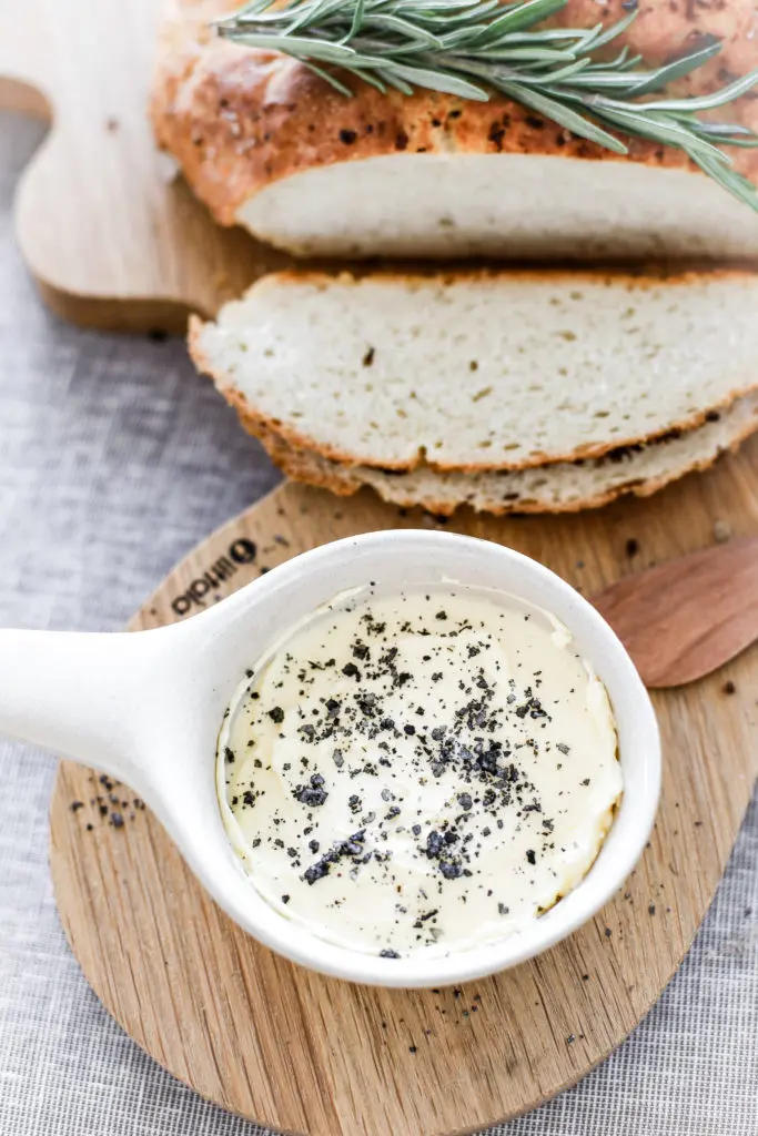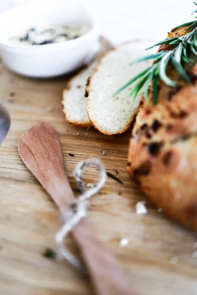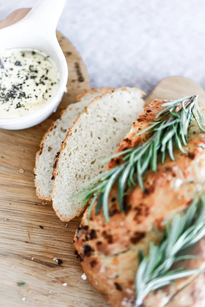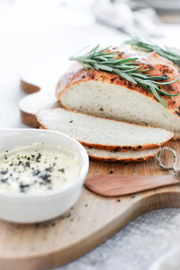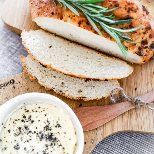 Heimabakað brauð með stökkri hvítlauks og rósmarínskorpu og þeyttu öskusmjöri