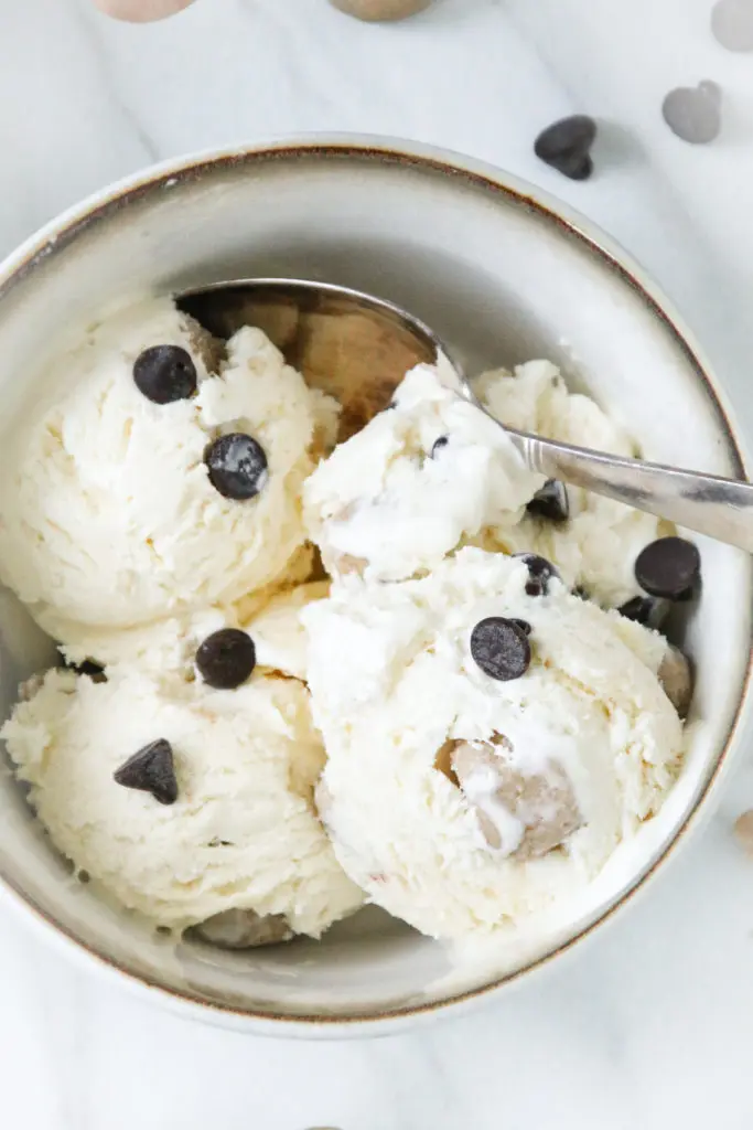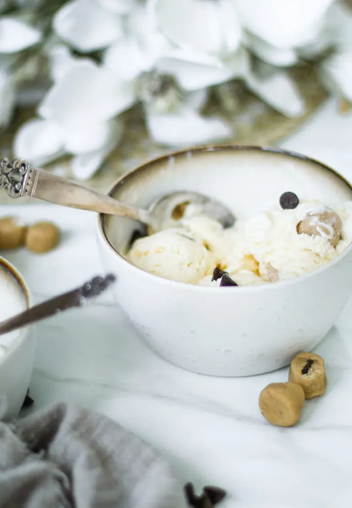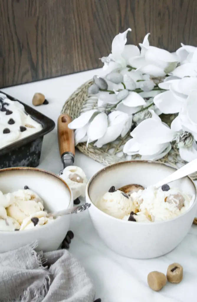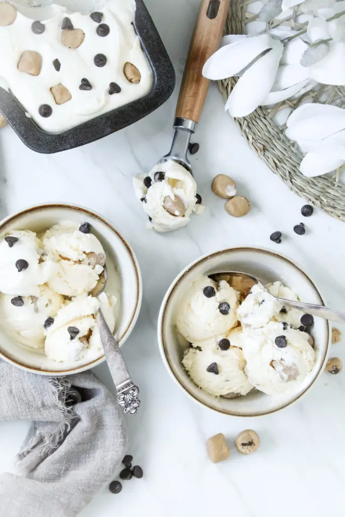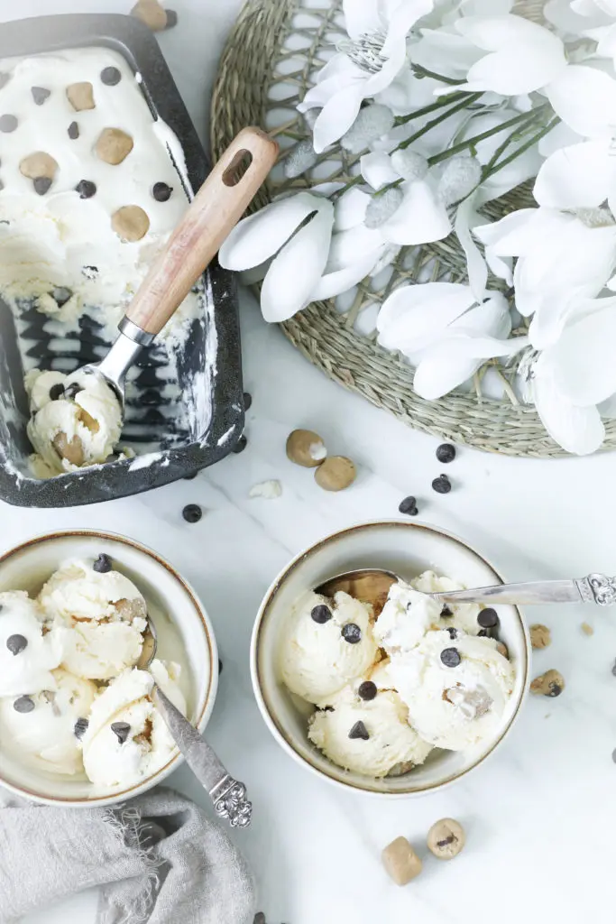 Niðursoðin mjólk kallast condensed milk í verslunum og er hún oftast staðsett þar sem kínamatur er geymdur. Kökudeigið er frekar stór uppskrift og mæli ég með því að þið frystið afganginn til að gera aftur ís seinna, en einnig er gott að borða deigið með kaffinu sem dæmi. Svo er auðvitað hægt að tvöfalda uppskriftina af ísnum og gera tvo ísa.