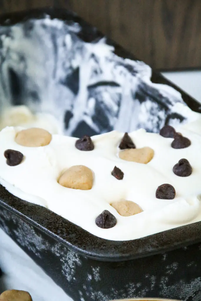 - Setjið svo 1/3 af ísnum í mót og dreifið svo kökudeigi og súkkulaði dropum yfir