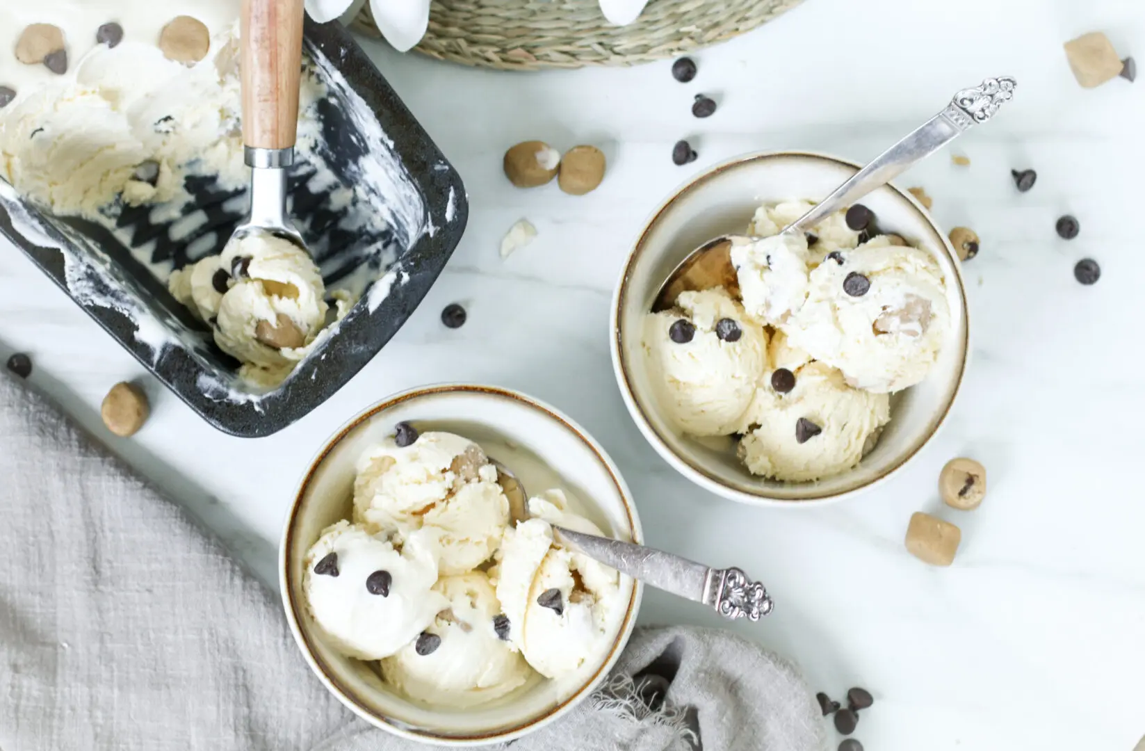 Niðursoðin mjólk kallast condensed milk í verslunum og er hún oftast staðsett þar sem kínamatur er geymdur. Kökudeigið er frekar stór uppskrift og mæli ég með því að þið frystið afganginn til að gera aftur ís seinna, en einnig er gott að borða deigið með kaffinu sem dæmi. Svo er auðvitað hægt að tvöfalda uppskriftina af ísnum og gera tvo ísa.