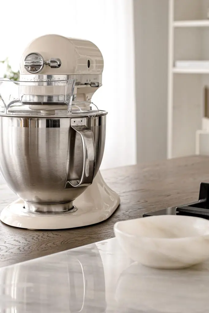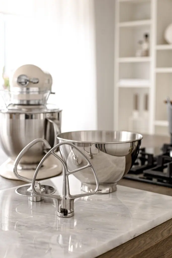 Með vélinni fylgir auka 3 l skál sem er snilld þegar þarf ekki stóra skál, hveitbraut, 6 víra þeytari, flatur hrærari og deigkrókur sem er allt úr riðfríu stáli og má fara í uppþvottavél.