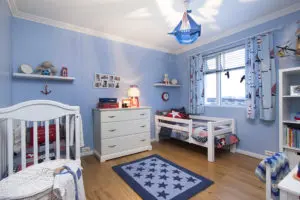 Þegar kom að því að gera strákaherbergin í húsinu þá var ég smá lost. Manni detttur alltaf fyrst í hug blár fyrir stráka og var sá litur á herbergi bræðranna á gamla staðnum okkar í Garðabænum. Mér fannst það vera fallegt í þeirri íbúð en það hentaði alls ekki hér í þessu húsi. Í gamla herberginu þeirra var Laura Ashley stíllinn svoldið ráðandi en hér fyrir neðan er mynd af gamla herbergi Reynis Leo og Mikaels.