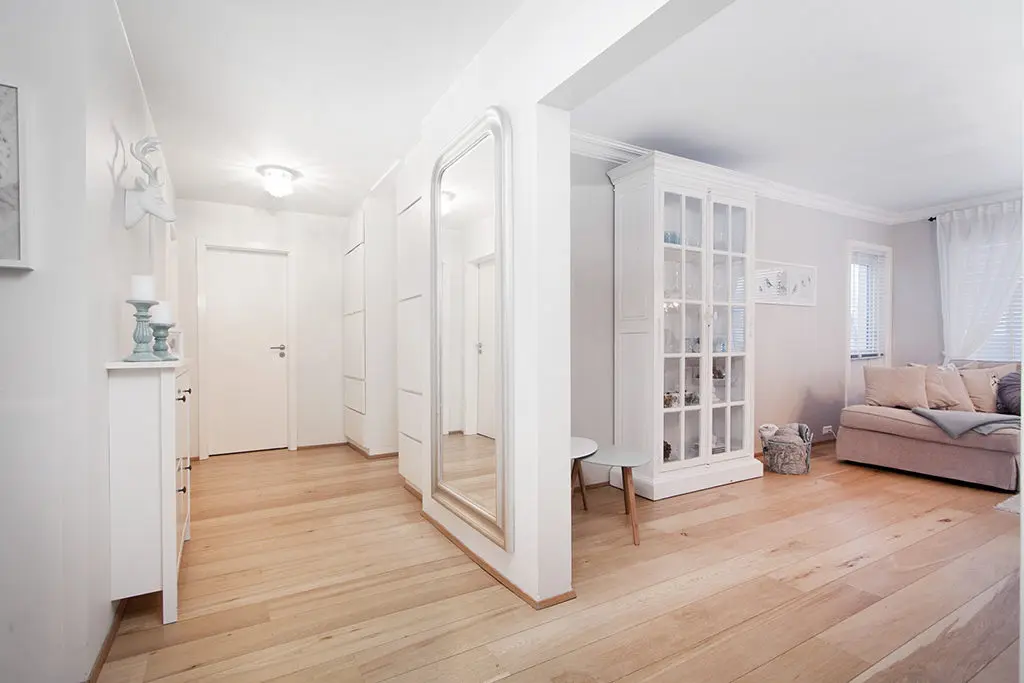 Hurðin orðin hvít, komið nýtt parket og gólflistar sem ég algjörlega elska og eru á öllu húsinu.