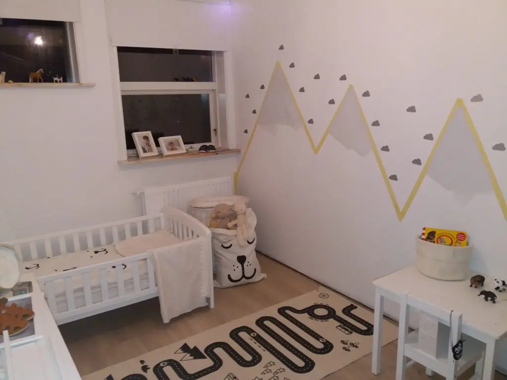Um leið og blái liturinn var kominn upp sá ég að hann var algjört NO NO. Hann bæði minnkaði herbergið svakalega og dró það niður. Það virkaði bara lítið og dimmt. Eftir að vera búin að liggja yfir pinterest og screenshota óteljandi strákaherbergi fann ég loks hvernig ég vildi hafa herbergið, og er ég alsæl með útkomuna. En hér fáið þið að sjá fyrir og eftir myndir af Herberginu hans Mikaels 2 ára sjarmörsins míns og eina brúneygða barninu mínu 😉