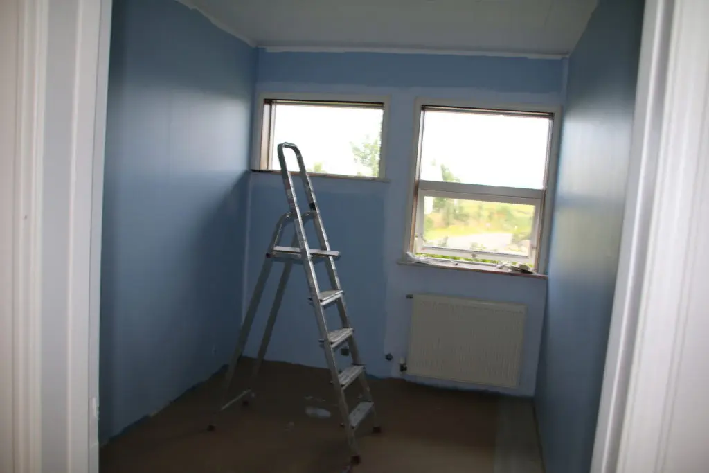Hér er svo búið að setja upp bláa litinn, eins og sést er hann alls ekki nógu góður þarna inni og gerði allt mjög dökkt. Því ákváðum við að leggja áherslu á hvíta litinn til að birta rýmið upp og setja falleg fjöll á vegginn sem við máluðum á með grárri málningu. Við blönduðum gráu tónana sjálf með því að blanda saman hvítri og svartri málningu. Panellinn í loftinu var líka sprautaður mjallahvítur á öllu húsinu.