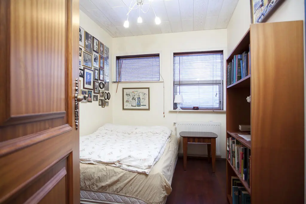 Svona leit herbergið út þegar við komum að skoða húsið. Fallegt og notalegt herbergi sem var notað sem gestaherbergi. Eins og þið sjáið þá var allt mjög dökkt á herberginu. Gólfefni og hurðir voru úr dökkum við og svo voru allir gluggakarmar parketlagðir.